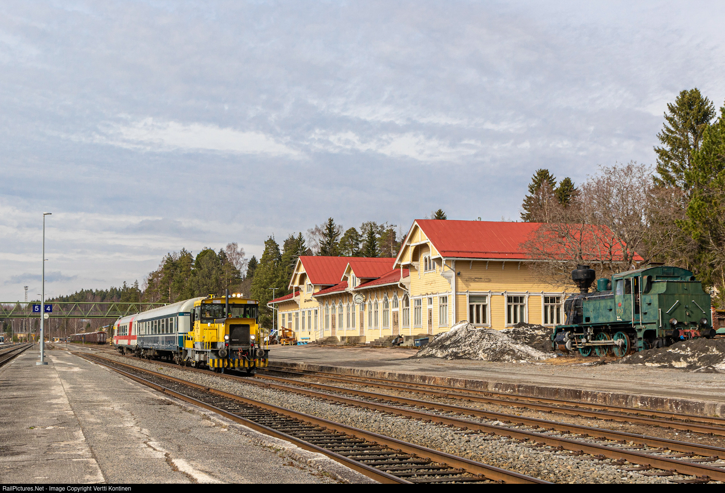 | Keitele Museo Oy Tka7 class diesel "track truck" screaming through Haapamäki with a charter train MUS 1987 from Vaasa to Jyväskylä. The train was operated by another operator, SVY (Sinisten Vaunujen Ystävät Ry) since Keitele Museo Oy is missing it's safety sertificate at the moment |