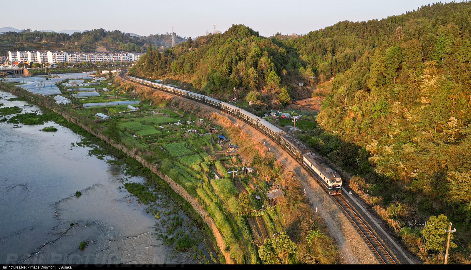 | A DF11 locomotive operating express service in the mountainous areas of Southern Anhui Provience was riding over river valley. |