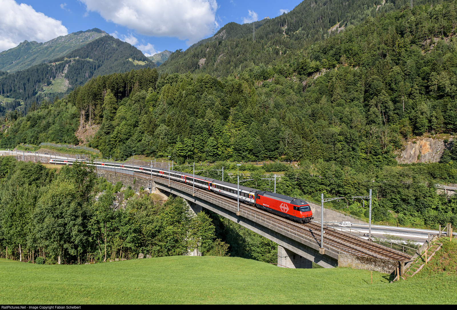 From 23 July to 07 August 2022, the national camp of the Boy Scouts took place in Goms. For the arrival and departure many extra trains were used. Some of the scouts stayed only one week in the camp and left after one week again or arrived after one week. For the arrival on July 31st, this shuttle train with a Re 460 also ran to Göschenen, where the children then changed to the trains of the Matterhorn Gotthard Bahn. On the way down, the empty train could be photographed on the Intschireuss bridge. With 74m height it is the highest bridge of the SBB.
