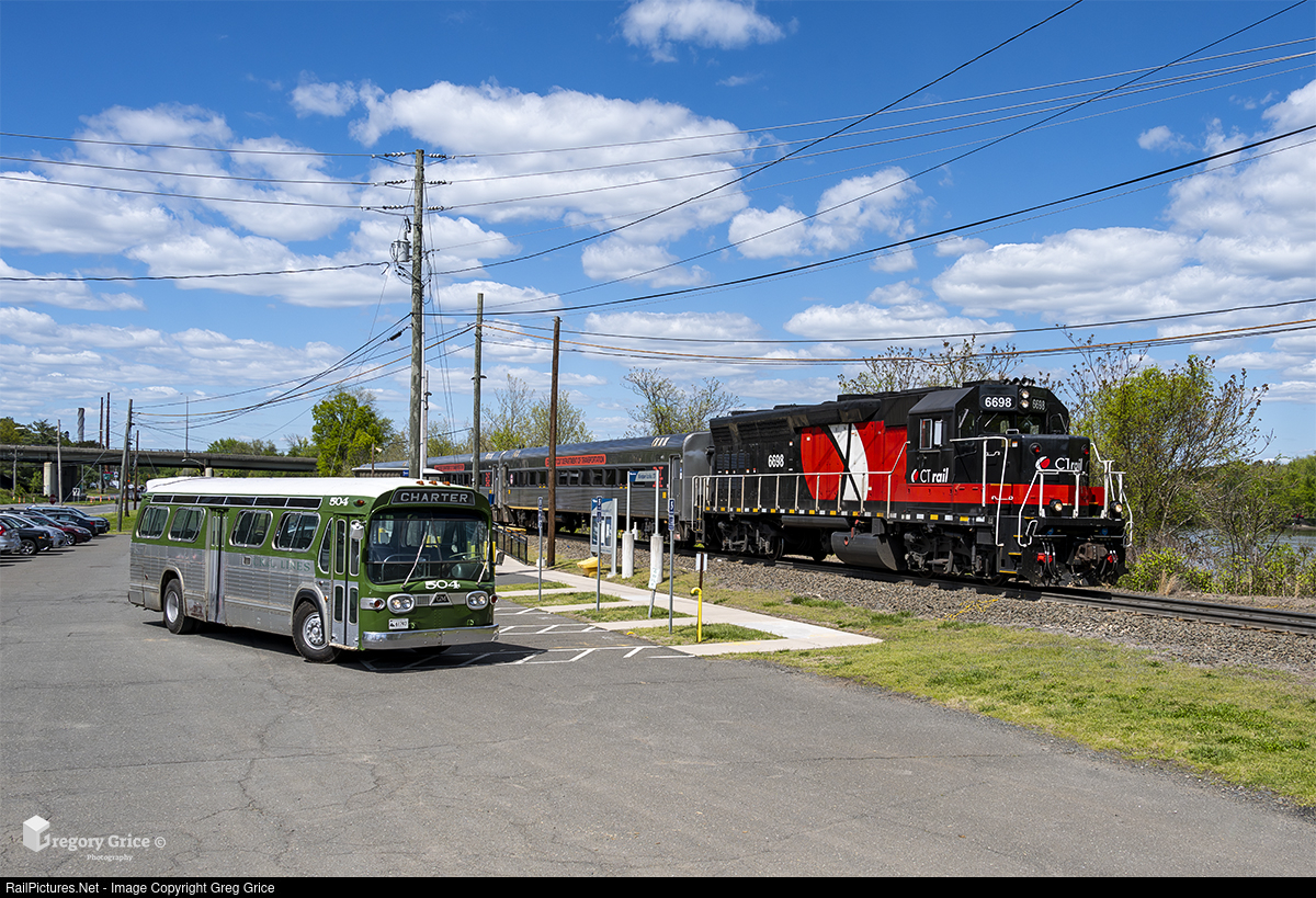 On the afternoon of May 6th, 2023, Connecticut Department of Transportation (CTDOT)/CTrail EMD GP40-3H #6698 sits on the point southbound CTrail train 6455 as it makes its station stop at Windsor Locks, Connecticut. Meeting the train is Connecticut Railway & Lighting Company GMC "Fishbowl" #504 which was out on a road run from the