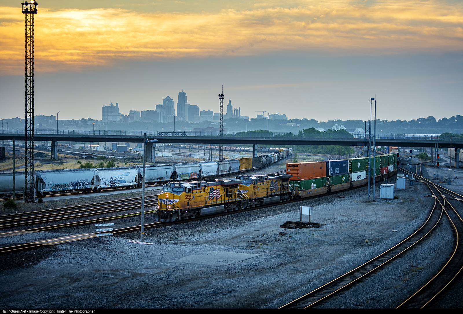 Daybreak At Armourdale | A colorful sky and the skyline of downtown Kansas City, MO make up the backdrop of this scene where a pair of GEs lead an intermodal train through the Armourdale area of Kansas City, KS on the morning of Sunday, May 7, 2023.