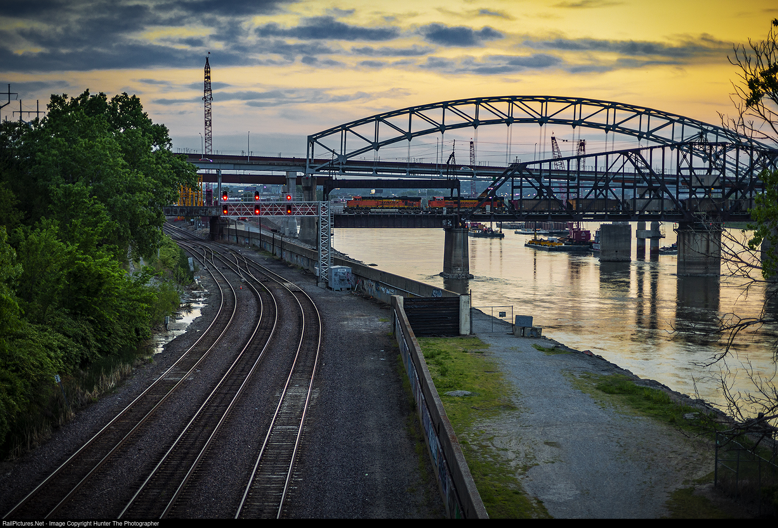 Missouri River Crossing | Heading south across the Missouri River on the Hannibal Bridge, a loaded coal train enters Kansas City, MO (leaving North Kansas City) at a snail's pace on the evening of Sunday, May 7, 2023.