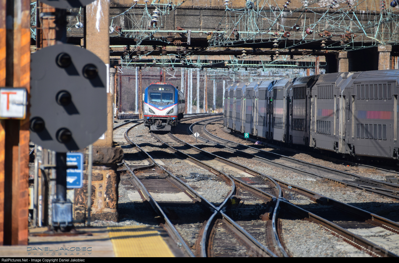 | Northeast Regional to Norfolk,VA , slows down and is about to stop at Trenton Station on a nice sunny Easter Sunday afternoon. |
