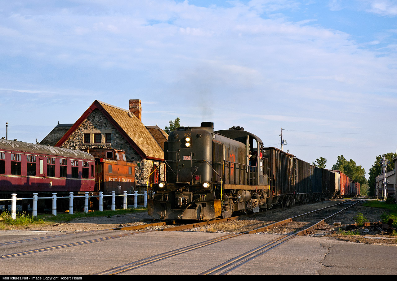 | Lake State Railway train 303 heads for Grayling, passing the stone Michigan Central depot at Standish, MI. Both 974 and the former PRR caboose adjacent to the depot wear Detroit & Mackinac paint (although the RS-3 is patched for LSRC). One of the two British Railways coaches displayed at the station is also visible. These cars arrived in North America via a tourist railway in Canada. |