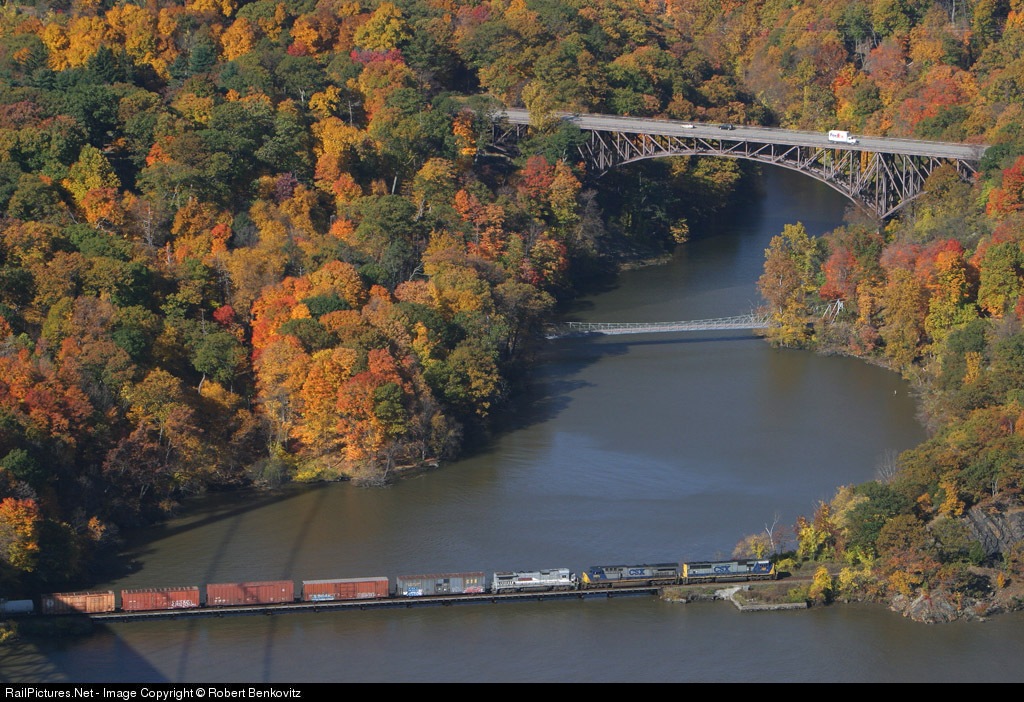 | Emerging from under the Bear Mountain Bridge (shadow on left), a northbound CSX merch is negotiating the trestle over Popolopen Brook, and is about to enter the short Fort Montgomery tunnel. |