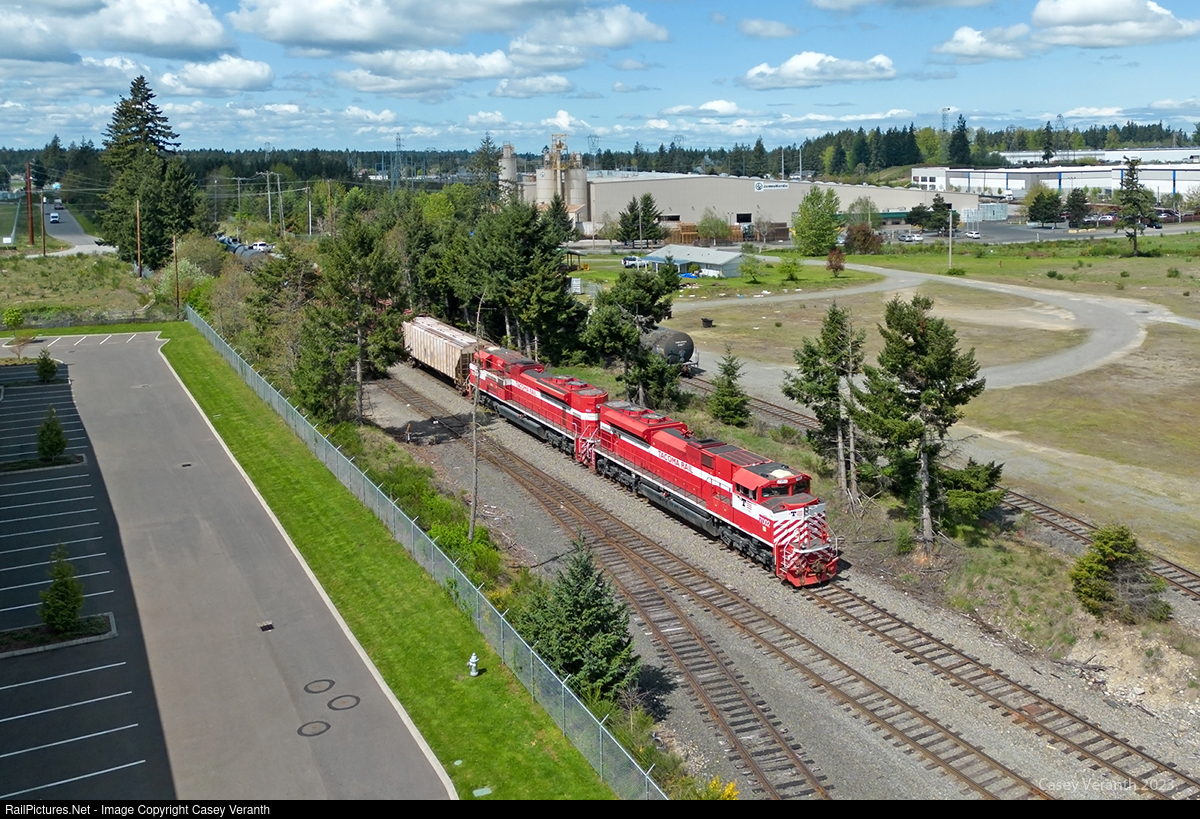 | This is one of the last freights to leave Frederickson to the north over Tacoma Rail's Mountain sub. Frederickson will continue to be served by rail as Rainier Rail will enter the area from the south over the former Milwaukee Road tracks to McKenna and Chehalis. The famous gulch with its 3.6% climb out of Tacoma could likely see its last revenue turning wheels this week. |