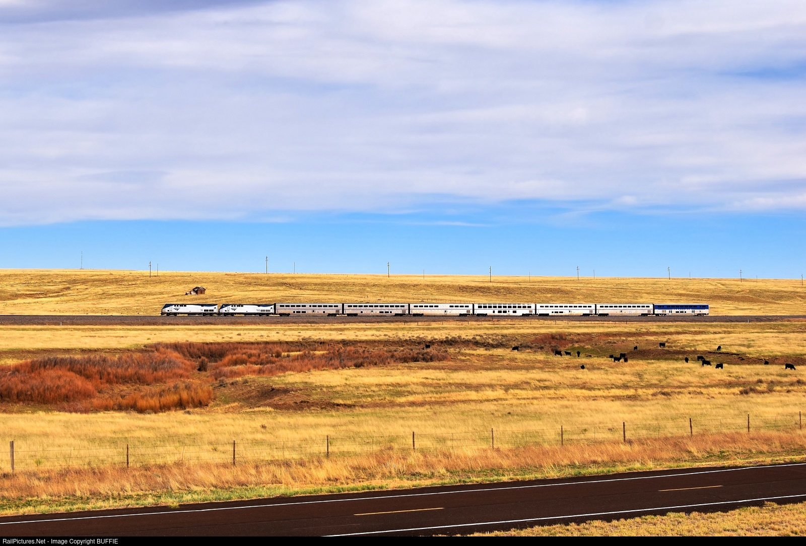 | The Southwest Chief runs through cattle land south of Springer, New Mexico, pulling a Surfliner car at the end of the train. |