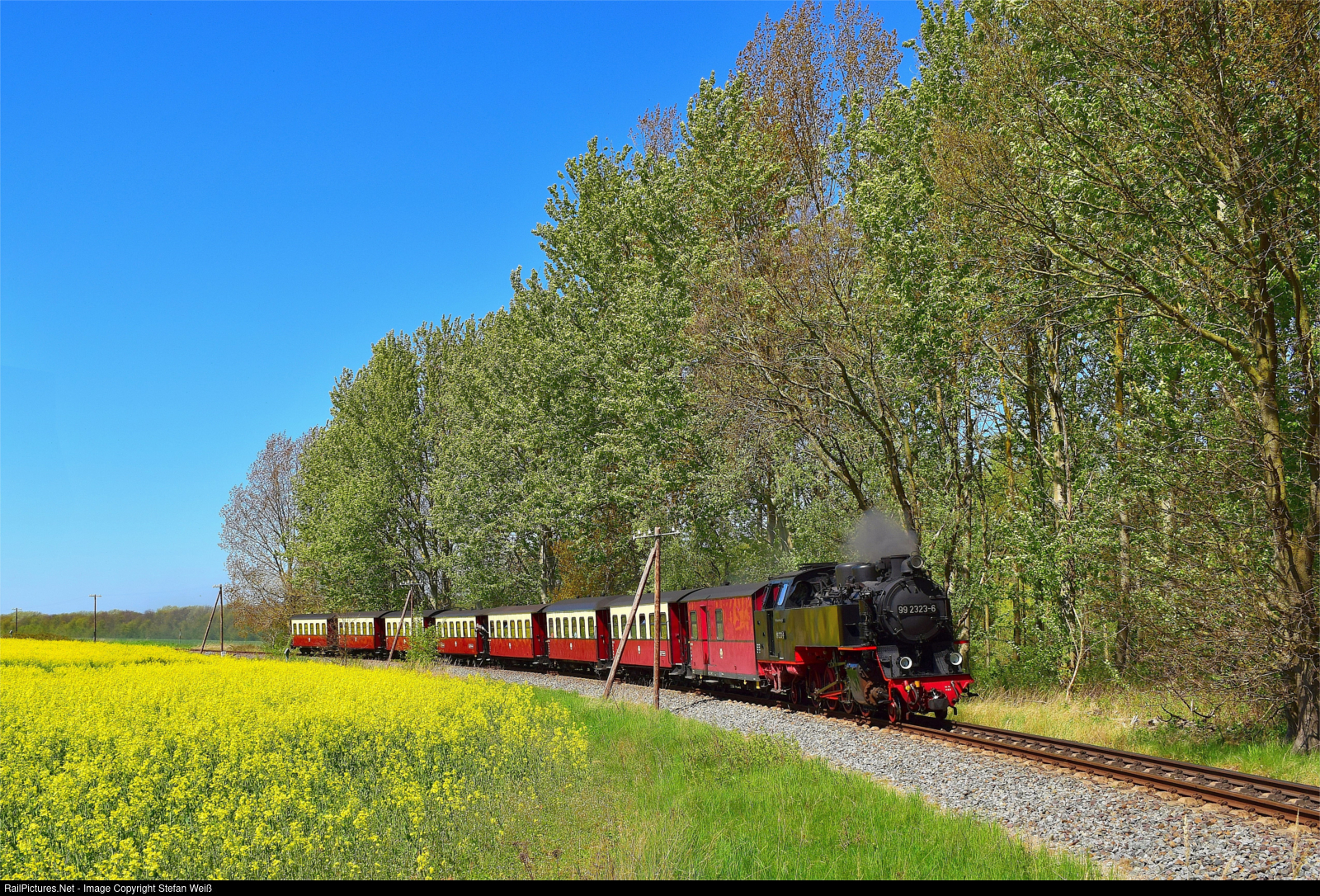 | With a train to Bad Doberan, the 99 2323-6 is on its way through the blooming landscape along the cliffs near Heiligendamm. |