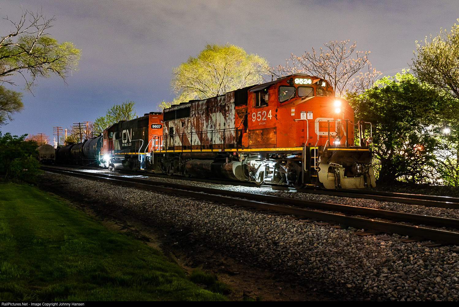 | It’s about 02:30 in the morning as CN L545, the “Millsdale Oil Local” switches out Seneca in Lemont with a CN GP40-2W and a IC GP38-2 before heading back to Glenn Yard and call it a night after a long night of switching. |