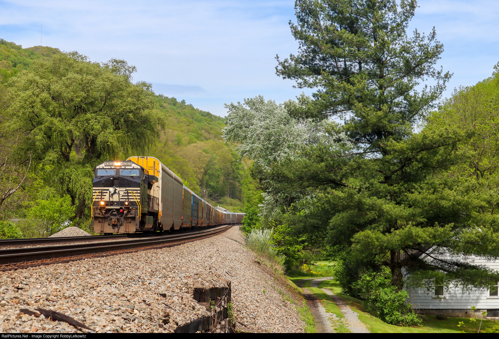 NS 4364 leads NS 11E west through Ada, WV, with a train with a long string of empty autoracks. |