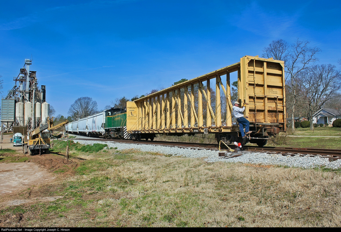 | I jumped ahead of this train wanting to get a shot of it passing the small grain silo. What I did not know was that they woukd work another customer first and come by shoving that car as the conductor held onto the front of the car. I remember thinking then that had ruined the shot. Now that I looked at it again ten years later, I realize it actually made the shot better. It's a part of railroading when you cannot run the car around the train to pull the entire consist. I used to watch the Lancaster and Chester Railway do this from my grandmother's kitchen window in Lancaster, South Carolina.ARC 12 is an EMD SW1500 built for Southern Pacific as SP 2659,Weyerhauser as WTCX 308. |