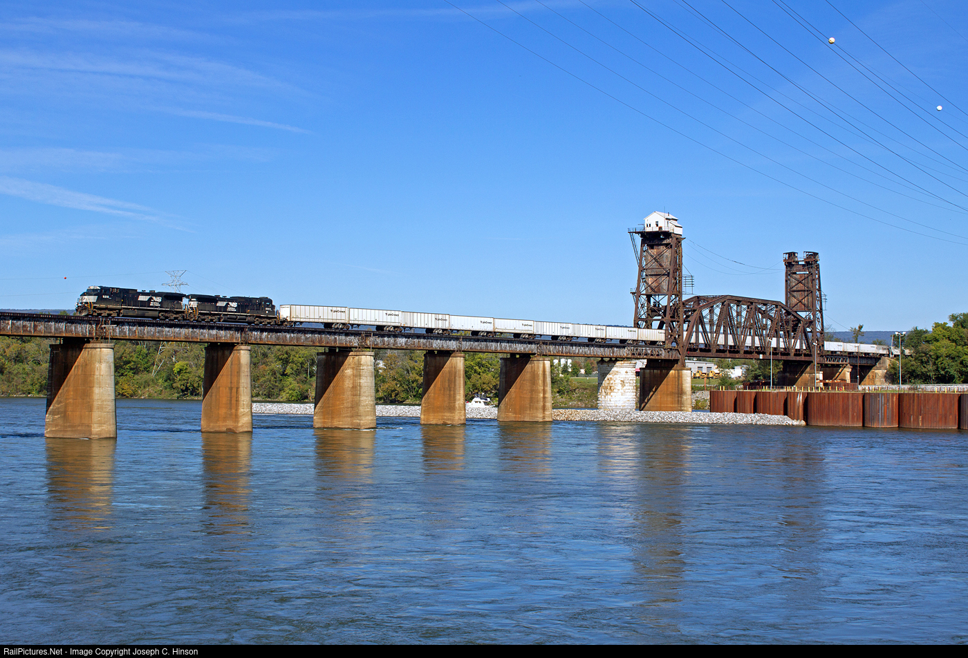 On October 19, 2014 a Norfolk Southern Triple Crown train cruises over the Tennessee River into Chattanooga from points westbound. Closr inspection will show you that the truck trailers are not actually suspended in air behind the power but are on small frames. Light and easy and made to travel fast. This is a vertical lift bridge near the Chickamauga Dam and Highway 153.