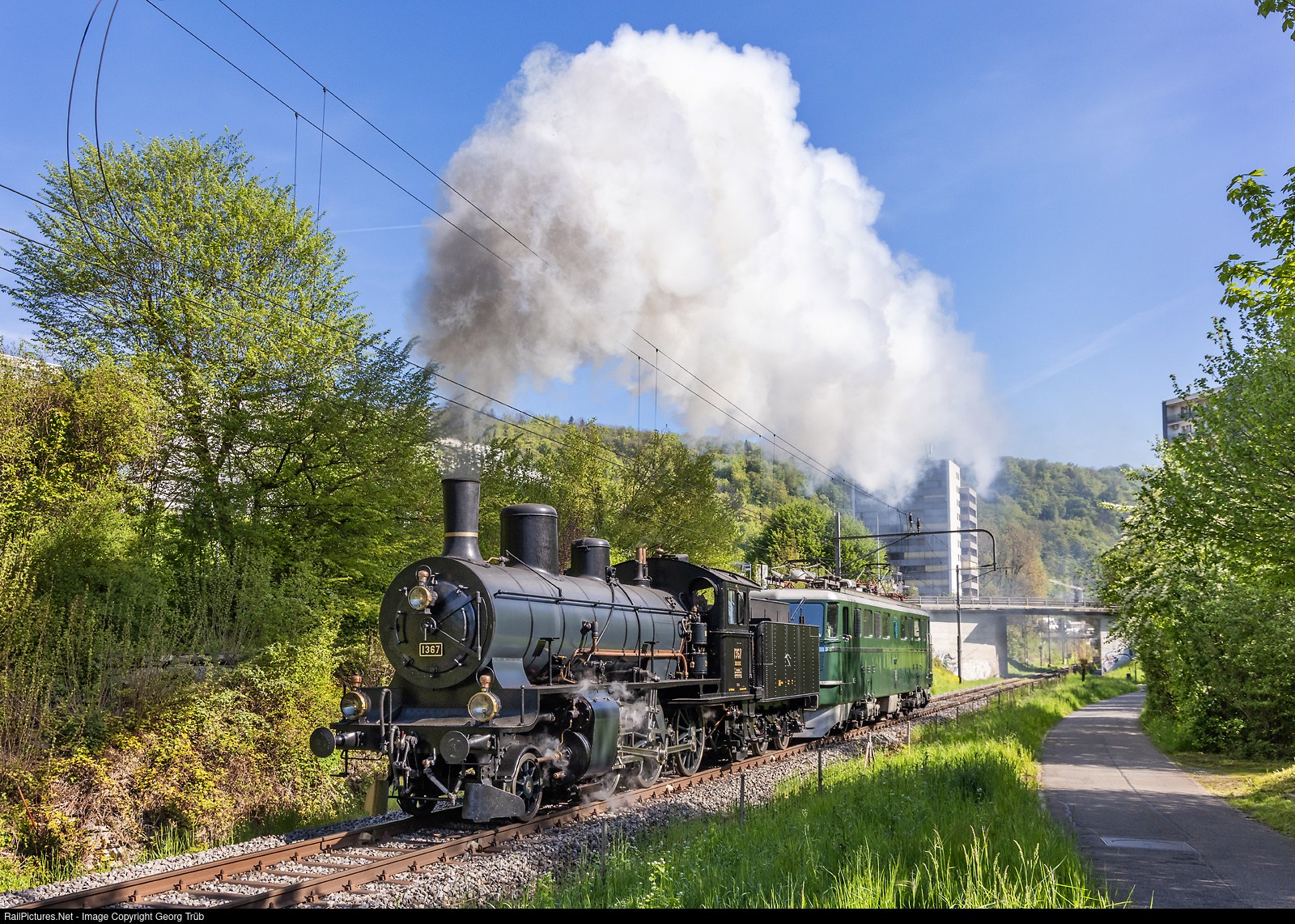 | 2-6-0 "Mogul" steamlocomotive B 3/4 # 1367 (SLM 1916) of SBB Historic is working hard on the 1.0 % grade from Baden Oberstadt to Dättwil, pulling the Ae 6/6 # 11407 "Aargau" of SBB Historic, on long term loan to association Mikado 1244. The electrolocomotive served as load on this test drive and used the electric brake for more load. |