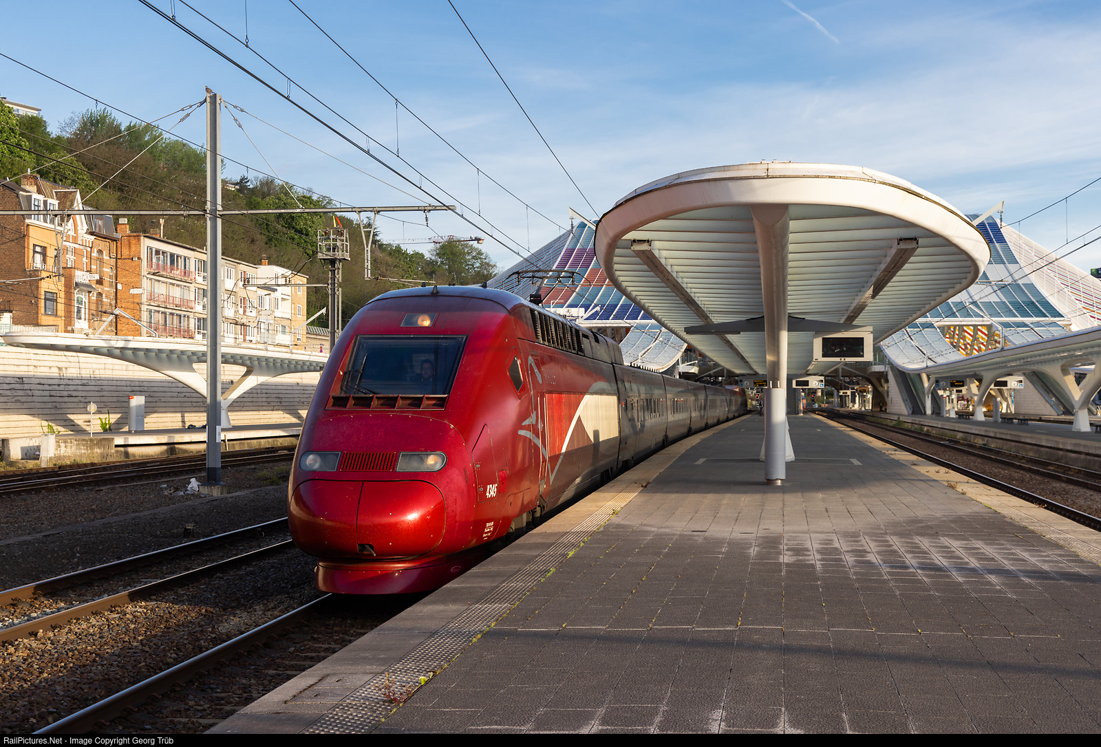 | The PBKA highspeed train # 4345 of Thalis, running as THA 9412 via Bruxelles Midi to Paris Nord, is leaving Liège-Guillemins station. Because of extensive track works on the line towards Ans, the train is leaving the station in the opposite direction as usual and will run via a detour towards Bruxelles. |