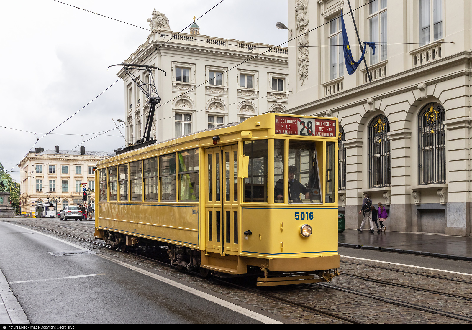 Streetcar # 5016 of the Tram museum Bruxelles near the Bruxelles-Central station, ready to pick up the group from Switzerland. These motor cars were built for the 1935 World’s Fair. They introduced an innovation to Brussels: as they were nearly 15 metres long it was impossible to have the tram’s wheels on two fixed axles. Consequently, the body rests on two bogies mounted on a pivot, each with its own motors and suspension. The elegance, comfort and speed of these trams made them unanimously popular. The Brussels Urban Transport Museum (MTUB) was founded in 1982 by members of the Société des Transports Intercommunaux Bruxellois (STIB) and a few amateurs with a passion for public transport.