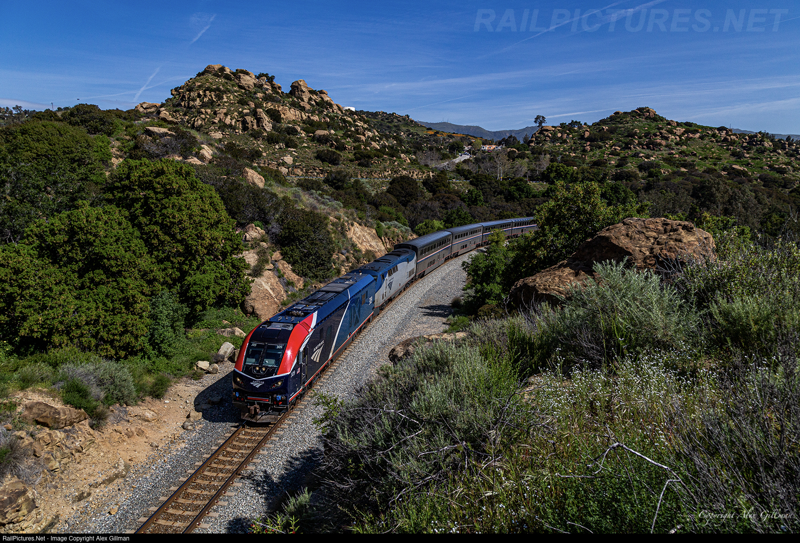 Plying the same right-of-way once graced by the Southern Pacific's famous Daylight passenger trains, today's Coast Starlight begins to bite into the grade of Santa Susana Pass as it leaves Chatsworth begin and heads for its next scheduled stop at Simi Valley.