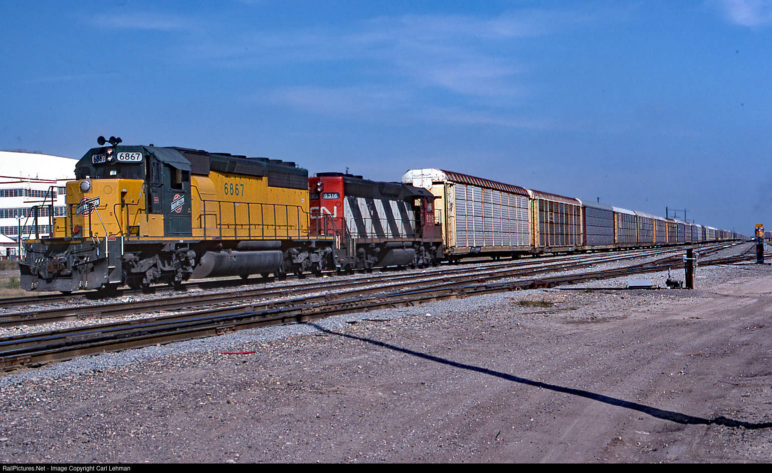 Now actually owned by UP this unit is in the last paint scheme and has teamed up to lead a large auto rack train.