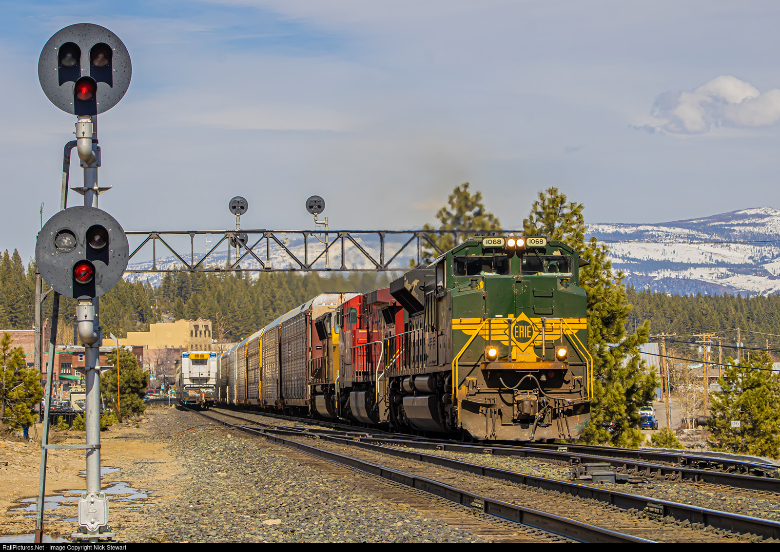 In some freak turn of events, NS heritage unit 1068, painted in the Erie Railroad colors, handles a Roper, UT to Milpitas, CA autorack train. Behind the 1068 is one of the CP AC4400's featured in the movie "Unstoppable". I followed this train from Lockwood, NV to Truckee, CA. Here in Truckee, SP infrastructure is still present, creating a strange scene with the foreign power and paint jobs.