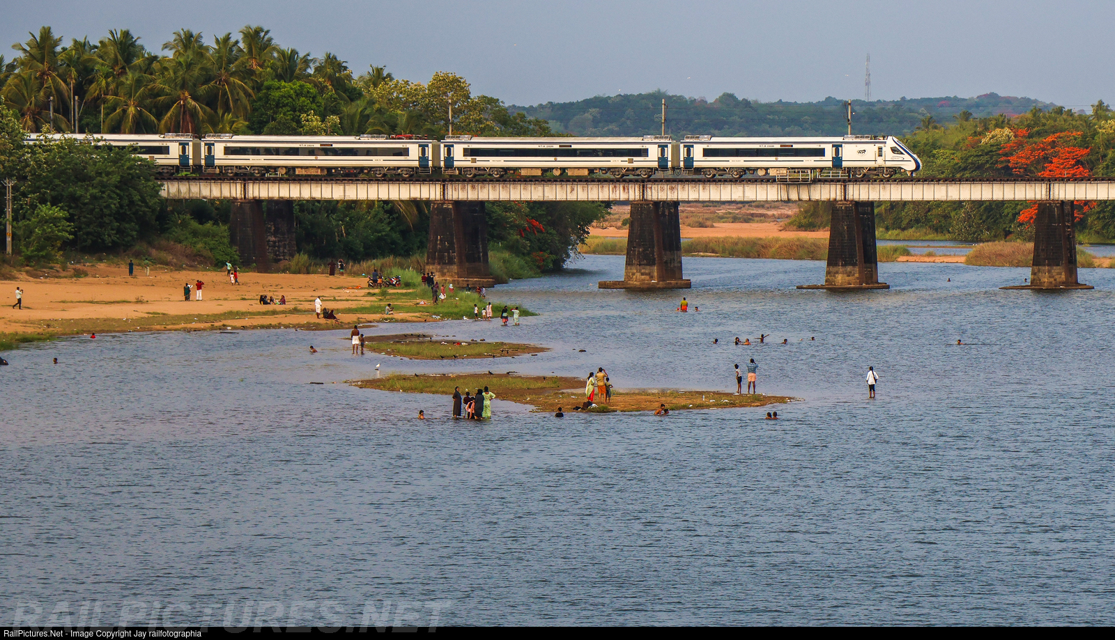 People who came to enjoy the cool breeze at sunset time watch and click VANDE BHARAT Express crossing the river