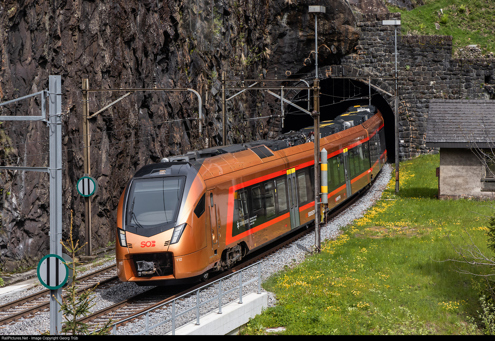 | "Traverso" RABe 526 # 112/212 of the Südostbahn (SOB), running as IR 2320 of the line IR 26 from Locarno via the Gotthard mountain line-Lucerne to Basel, is leaving the 1090 meter long Leggistein loop tunnel on the Gotthard north ramp between Göschenen and Wassen. |