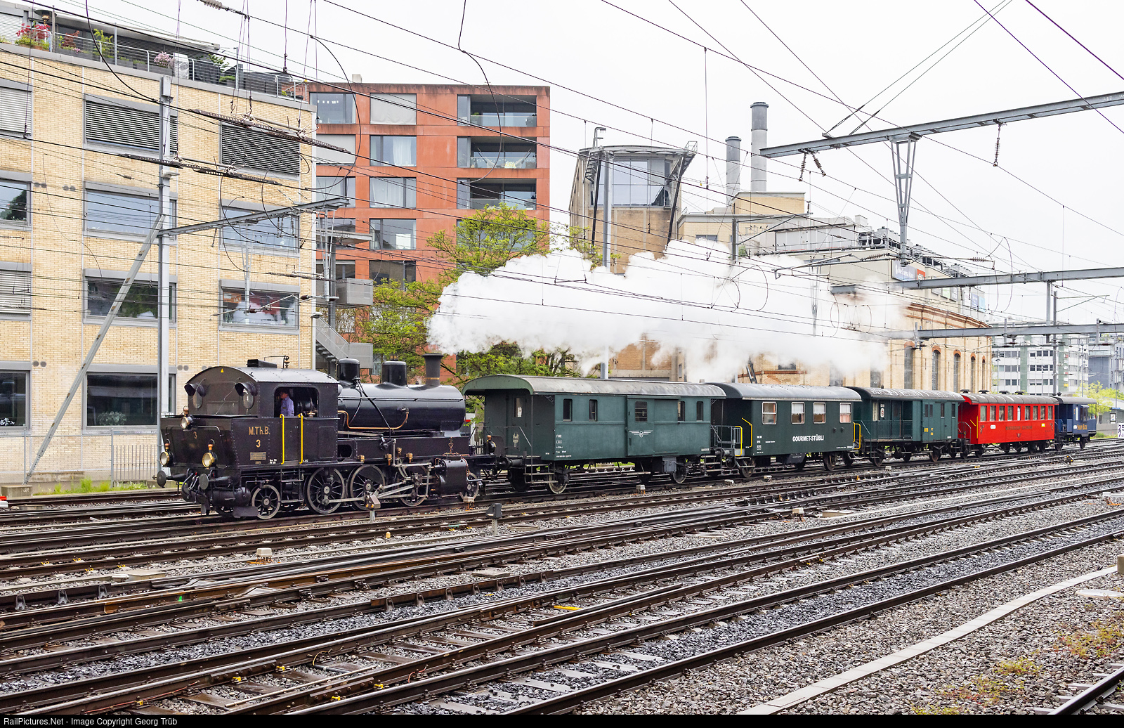 | Former Mittel-Thurgau-Bahn (MThB) 2-6-2 steamlocomotive Ec 3/5 # 3 of the association Historische Mittel-Thurgaun-Bahn pull the train 31740 from Romanshorn via Weinfelden-Frauenfeld to Winterthur Töss, running through Winterthur. The mother's day special train ran to Bauma afterwards, and back in the evening to Romanshorn. |