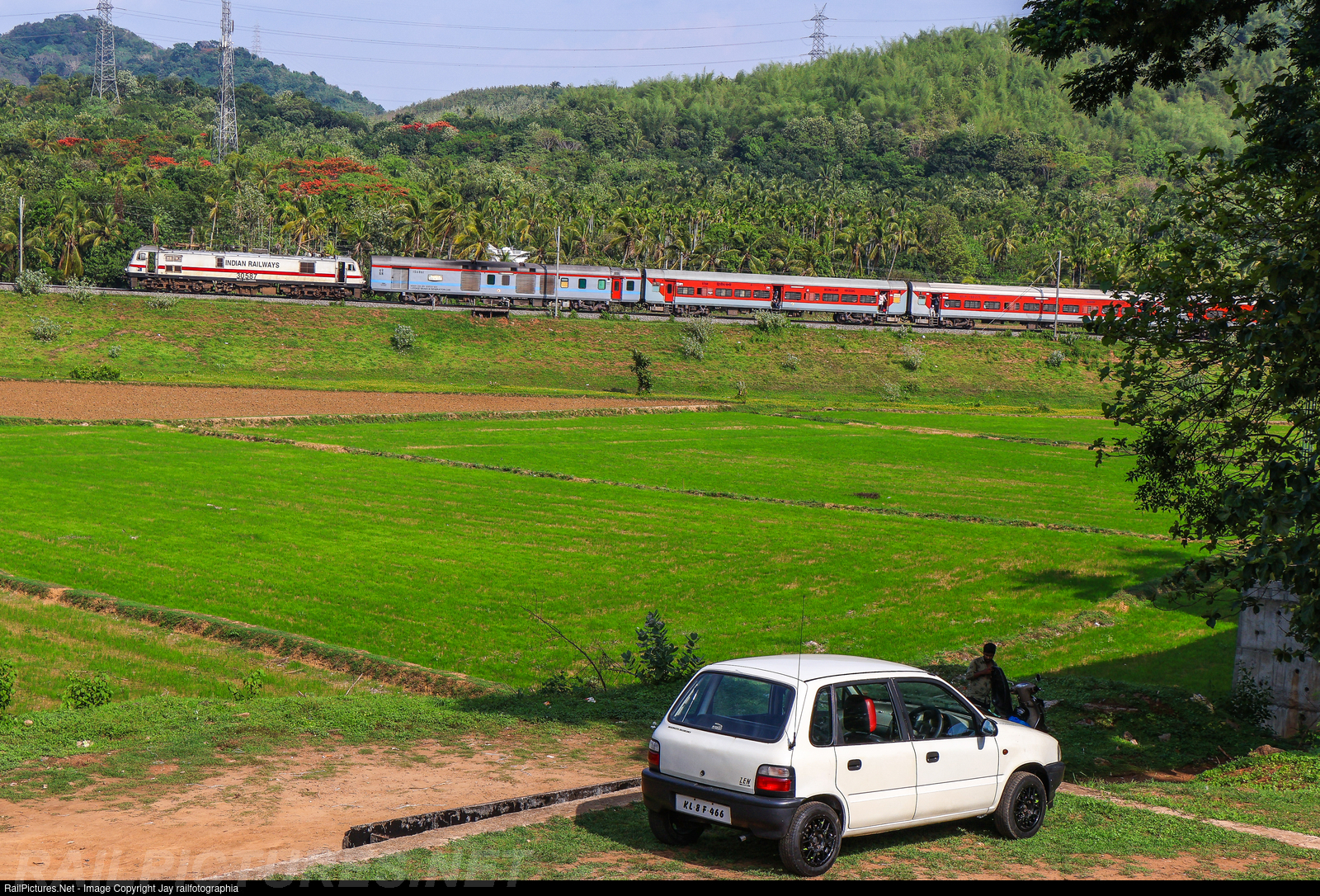 Netravati Express climbing Akamala mountain range as India's popular brand car, Maruti Suzuki ZEN, rests in foreground