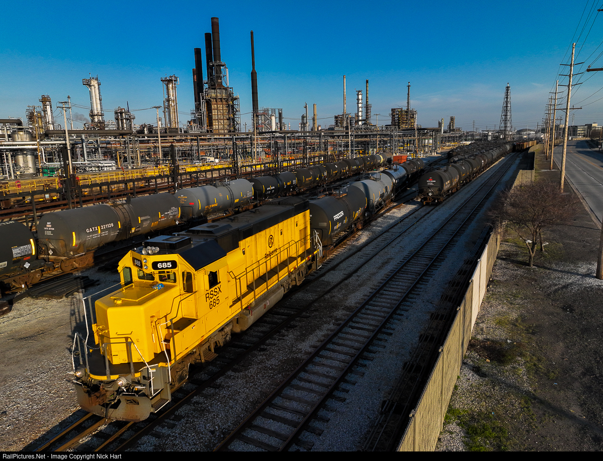 | The BP Whiting Refinery recently had a new contract service take effect and Rail Switching Service (RSSX) was the chosen one. GP15-1 #685, formerly of Missouri Pacific heritage, is seen shuffling tank cars around on a sunny evening. |