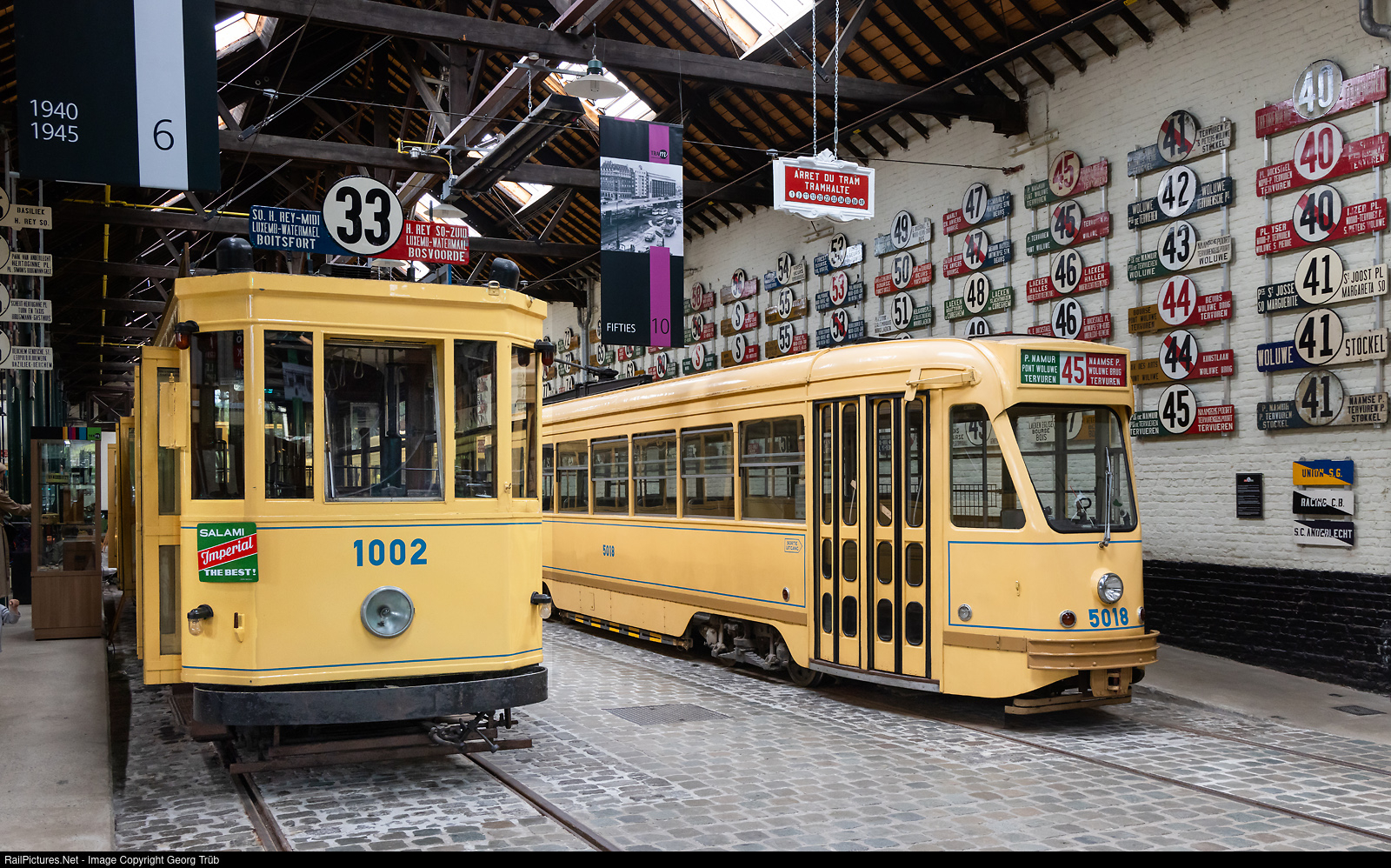 Tram Museum Bruxelles. On the left motor car # 1002. The 685 “standard” motor cars were closely linked to the image of Brussels for four decades, from the 1930s to the 1970s. They were built in less than five years in the transport company’s workshops. Their manufacturing process was highly industrialized. It was based on the pre-assembly of parts, which enabled production of one car per working day! The comfort of these trams was greatly improved after World War II thanks to the addition of doors, heating, and a conductor seat. Motor car 1002 is exhibited in its end-of-service condition. On the right PCC motor car series 5000 # 5018 built 1935, in operation til 1976. These comfortable trams served in Brussels between 1935 and 1976. The series had 25 trams and a few of them, including the 5018, were given a P.C.C. appearance.