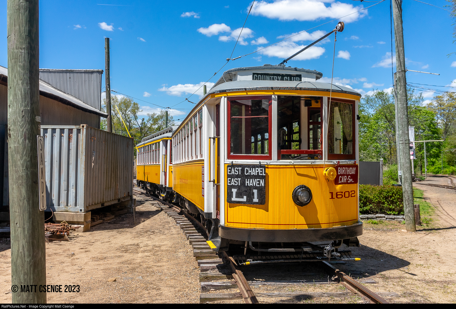 New York, not Connecticut. Connecticut Co. trolley no. 1602 (Wason, 1911) and a second Conn Co car are seen on the loop track at the Shore Line Trolley Museum. This day was the museum's New York Transportation Day event, so the two Connecticut cars were sidelined while equipment from New York City took center stage.
