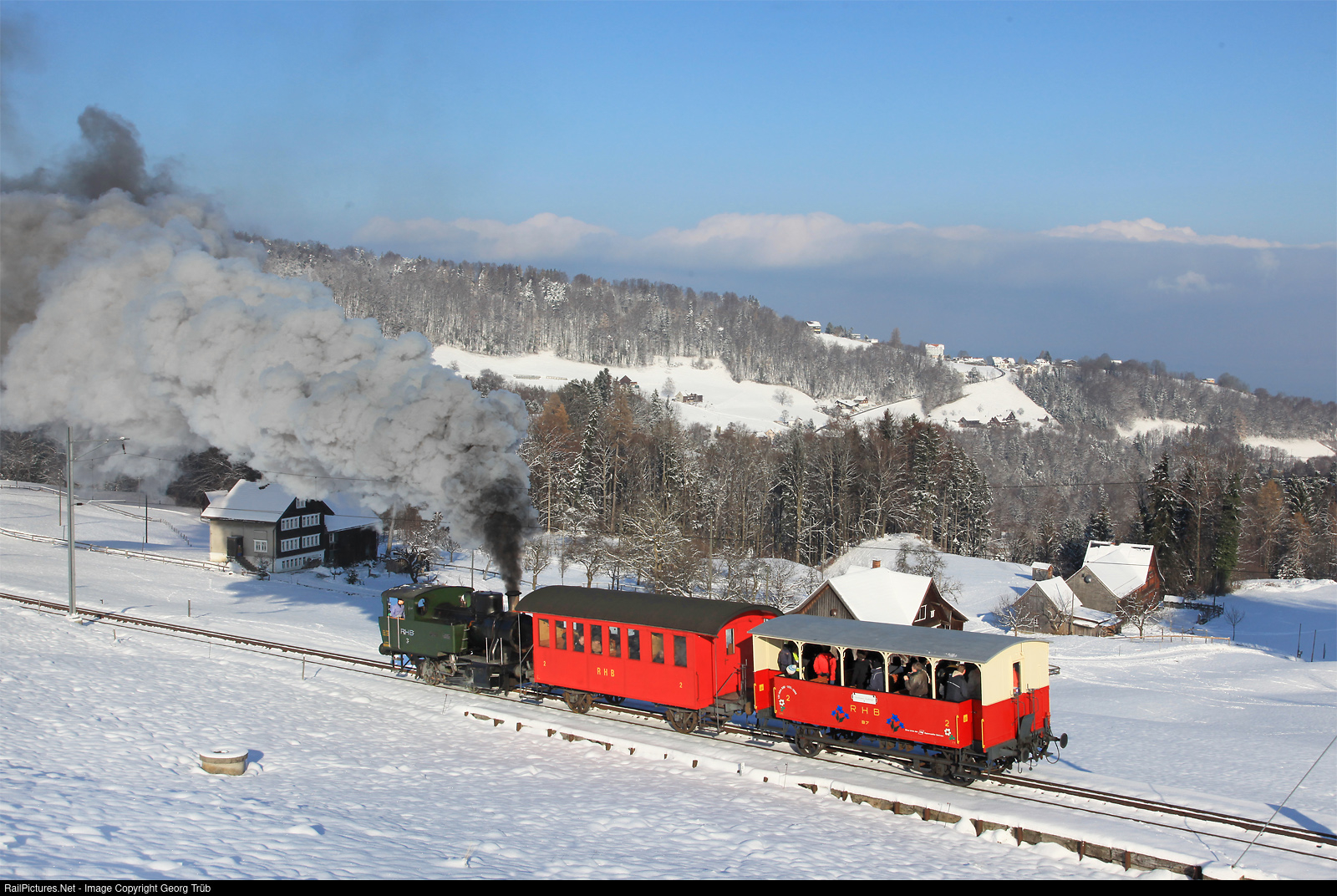 Chartered steamtrain for HAG Reisen on the rack railway Rorschach-Heiden-Bergbahn (RHB, now part of the Appenzeller Bahnen) with locomotive Eh 2/2 # 3 "Rosa" of the Eurovapor, built in 1951 by SLM for the Maschinenfabrik Rüti AG. The car C # 10 of the RHB in front of the locomotive dates from 1868 ! It was built for the Nordostbahn (NOB) and run on the RHB from 1904 till 1970, it belongs to Swiss Transport Museum Lucerne (VHS) now and is running on the RHB again. The open summer car B # 7 dates from 1875, when the Rorschach-Heiden Bergbahn was built. Since 2017, the locomotive is not operational any more, but should be repaired now til 2024.