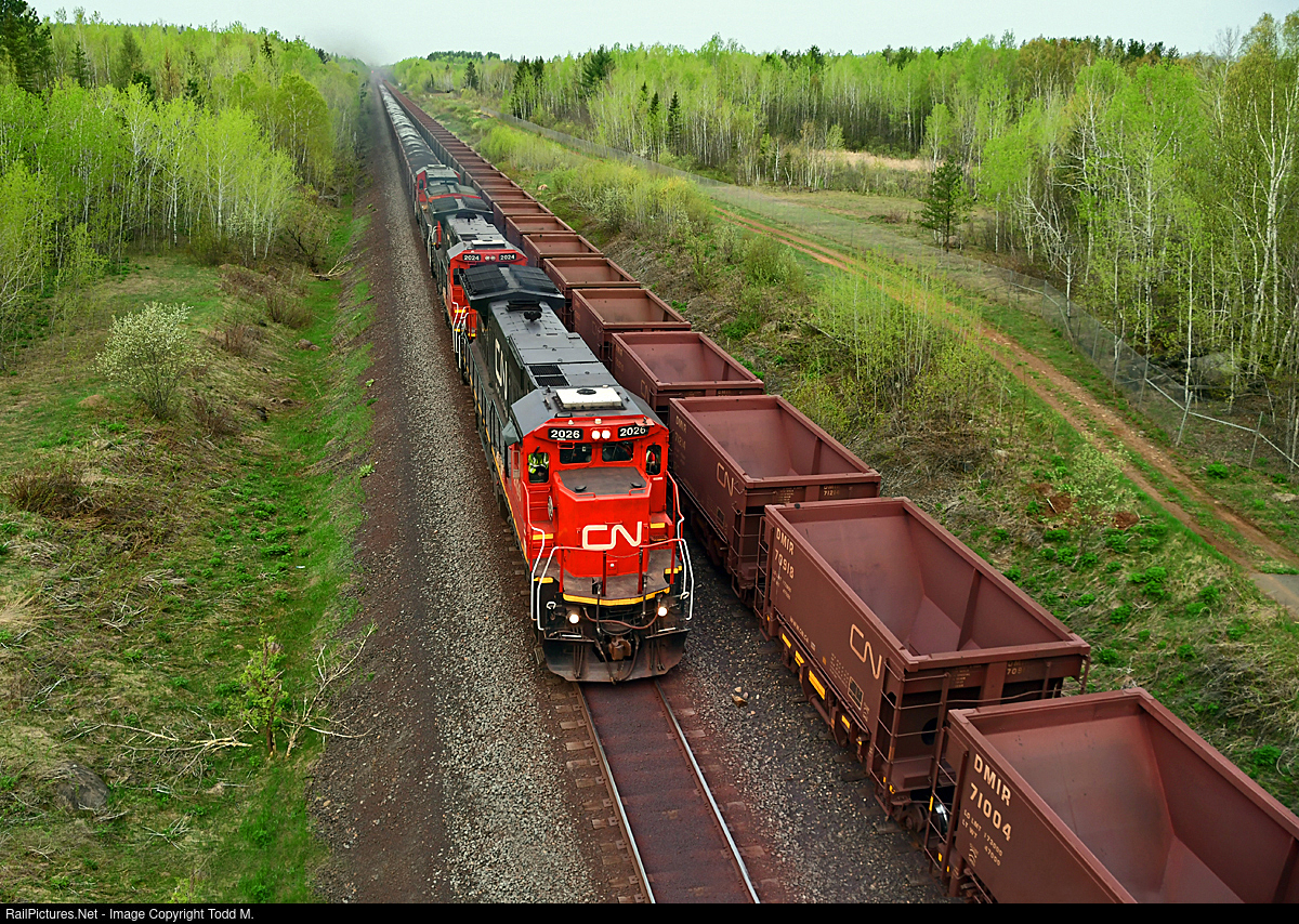 | Waited about six months to finally have leaves back on the trees and then during the peak of spring color the smoke from Canadian wildfires arrives and obscures the sun. Here's an early morning southbound from Minntac meeting a northbound going to Minorca at Gilbert. |