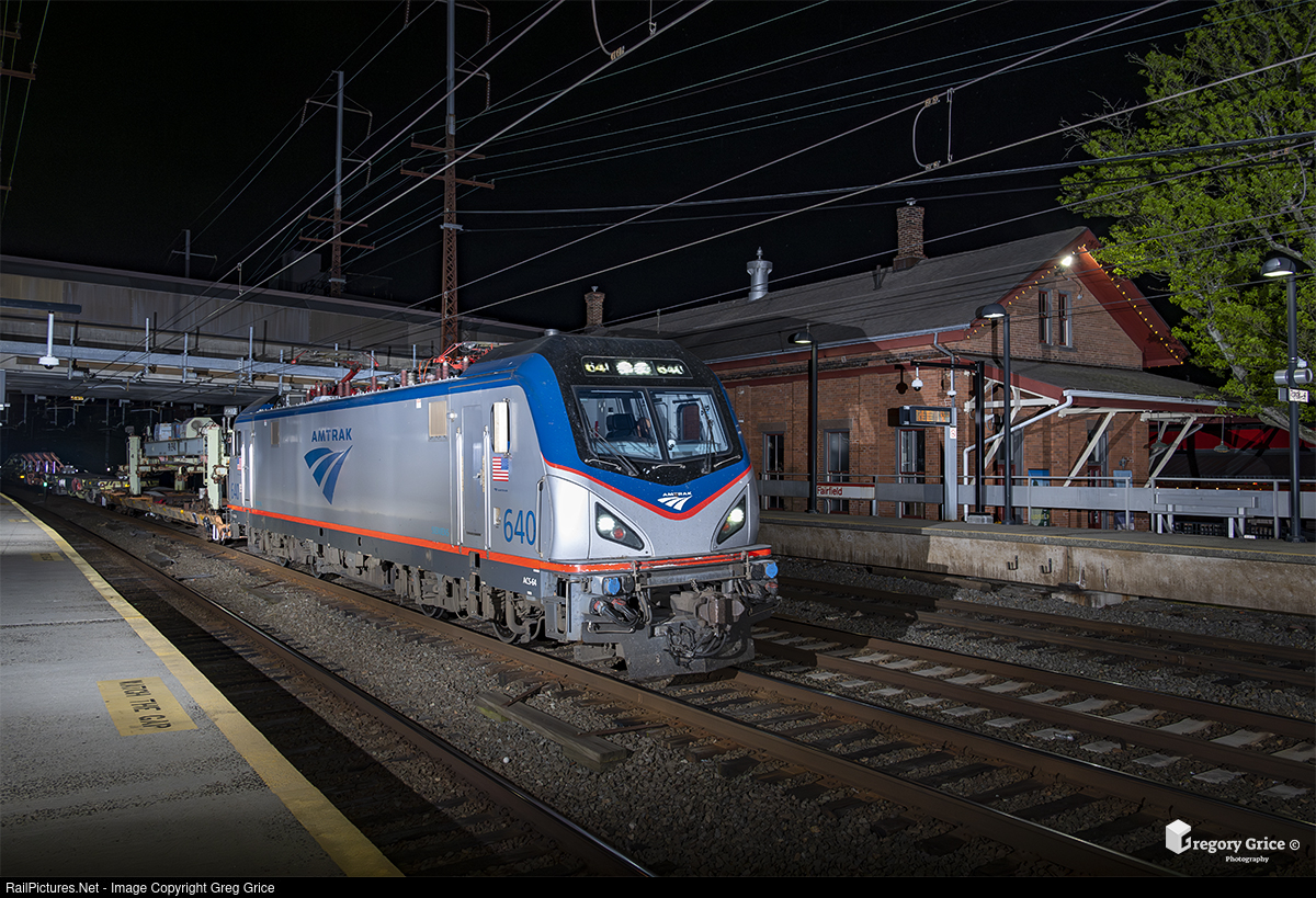 Amtrak Siemens ACS-64 640 hauls the Switch Exchange System (SES) work train west past Fairfield station depot on Metro North Railroad's New Haven Line during the early morning hours of May 14th, 2023. The consist is enroute to New Jersey after being utilized for a switch project on the upper Northeast Corridor in Davisville, Rhode Island.