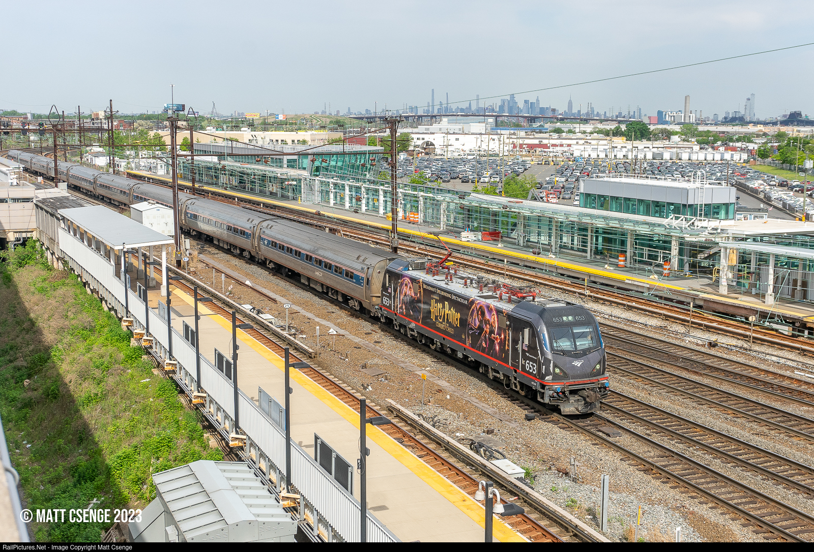 Amtrak ACS-64 no. 653 (Siemens, 2012-2016) is seen leading train 173 west through Harrison Station, en route to Washington, DC. The locomotive is one of four currently wrapped with advertisements for Harry Potter and the Cursed Child, a musical on Broadway.