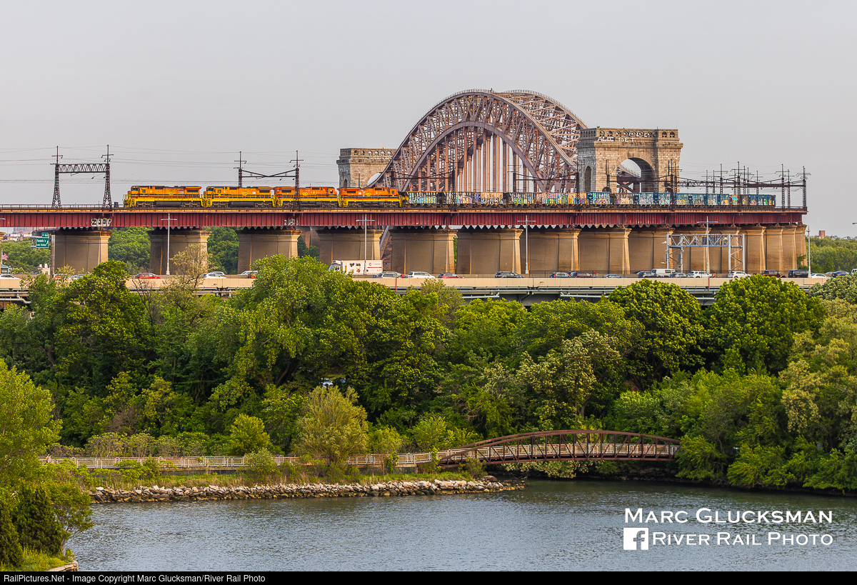 Matched Oranges. Genesee & Wyoming owned Providence and Worcester Railroad' tri-weekly train FPCH (Fresh Pond [Queens], NY-Cedar Hill [New Haven], CT) had a four-pack of GE C40-8s for power (4053, 4050, 4051 & 4052) on Wednesday, May, 17 2023 as it crossed the Hell Gate Bridge. The train is seen over Randalls and Wards Islands, which are in New York County, also known as Manhattan. The Hell Gate Bridge spans more than 3 miles between Astoria in Queens, New York and the Bronx. Completed in 1917, the Hell Gate is part of the New York Connecting Railroad which was jointly owned by the New York, New Haven and Hartford and Pennsylvania Railroads and created to provide a through route on the east coast. Today it carries Amtrak, CSX, and G&W Providence & Worcester trains, and soon is projected to carry Metro-North trains as well.