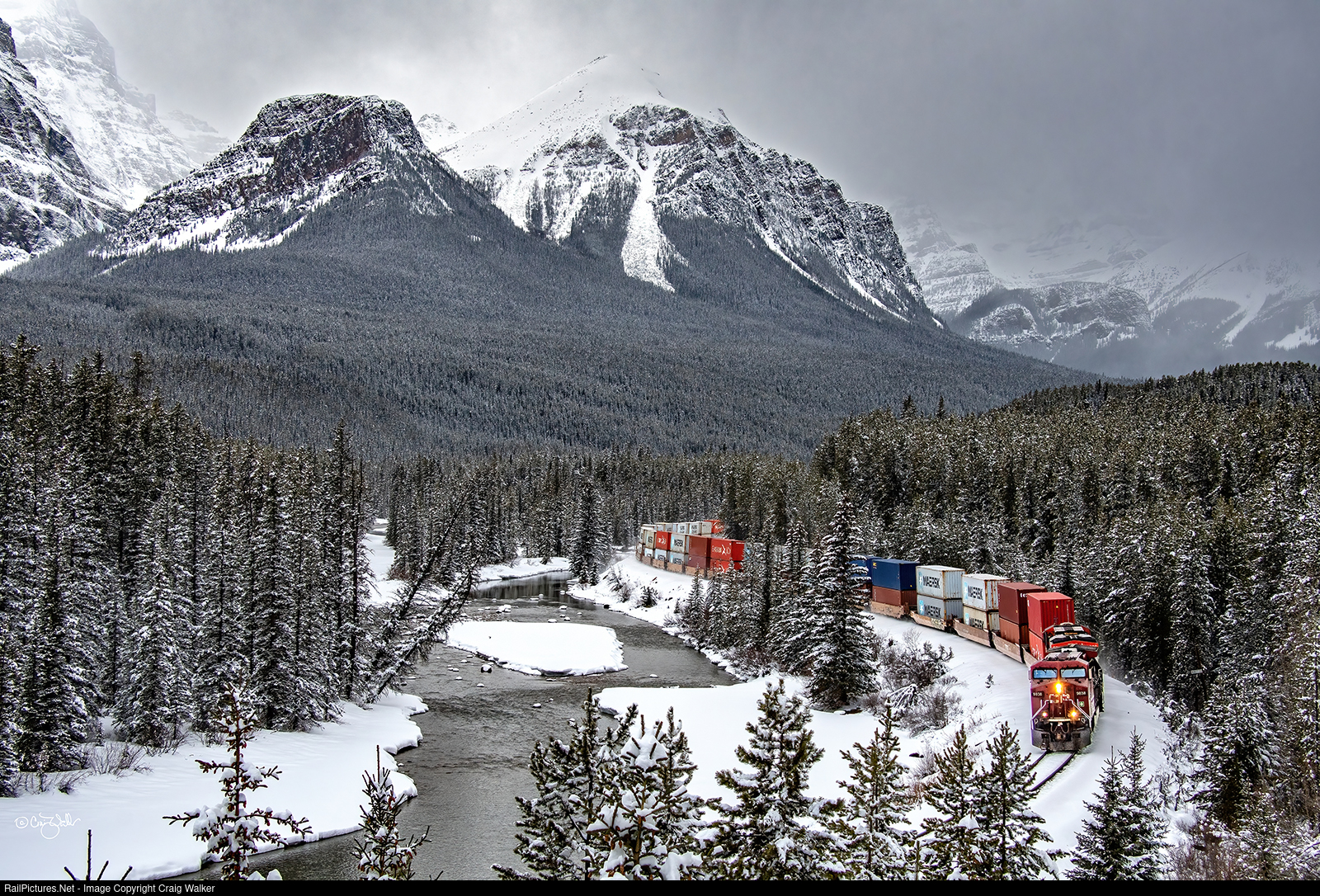 CPKC Railway intermodal train 112 (Vancouver IMS, British Columbia, to Côte Saint-Luc, Québec) follows the Bow River as it rounds Morant's Curve, within Banff National Park, in the Canadian Rockies. Canadian Pacific AC4400CW 9838 and Canadian National ES44AC 2916 are up front, with CN ES44AC 2868 as the mid-train Distributed Power Unit, and CP AC4400CW 9708 for the rear DPU. (Morant's Curve, Banff National Park, Alberta, Canada – April 17, 2023)