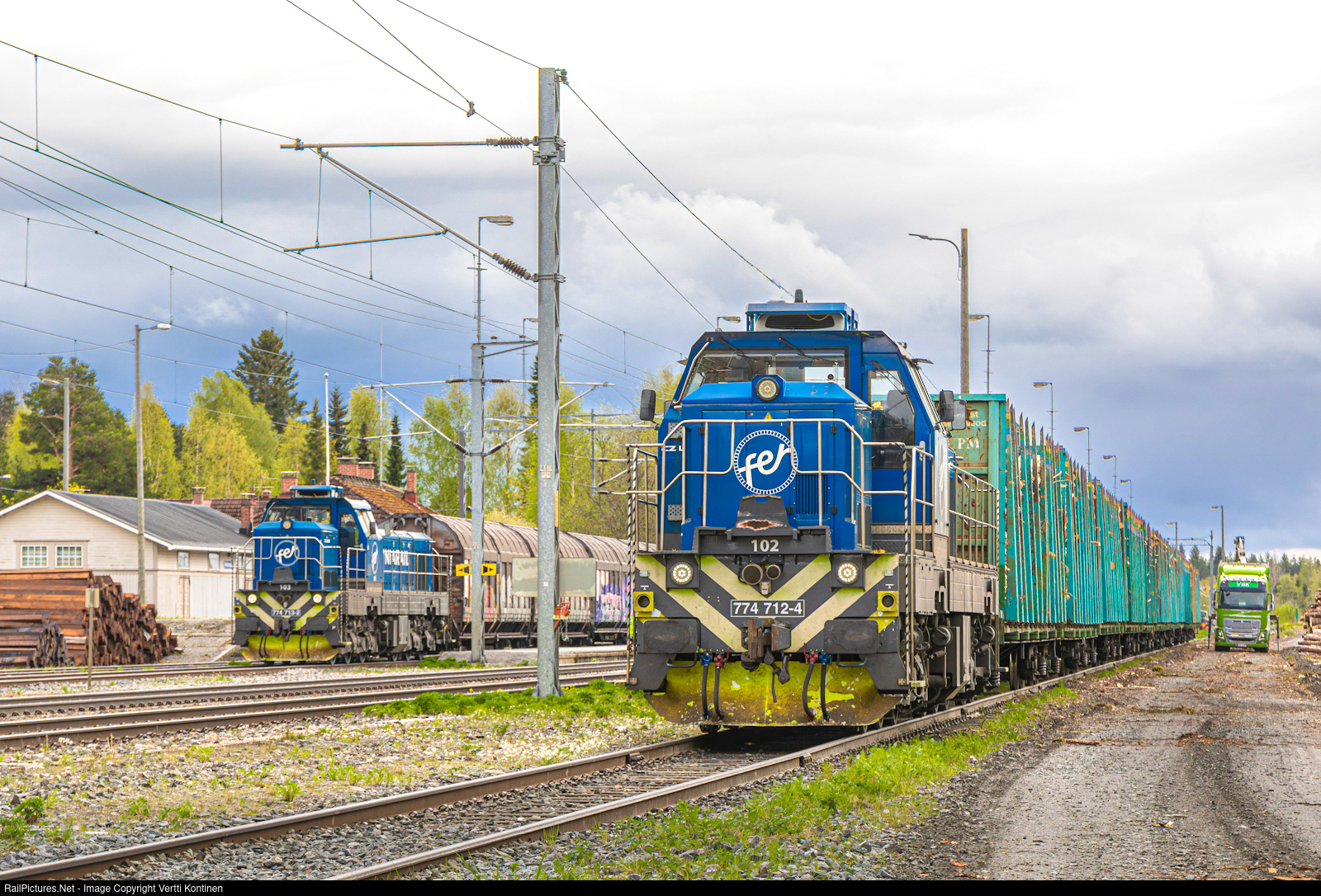 | Double Fenniarail switching action at Hankasalmi yard. Fenniarail Dr18 number 102 is seen picking a freshly loaded cut of cars from the timber terminal while in the background Dr18 103 is seen assembling a loaded saw wood train consisting of type Laaiis sliding wall box cars |