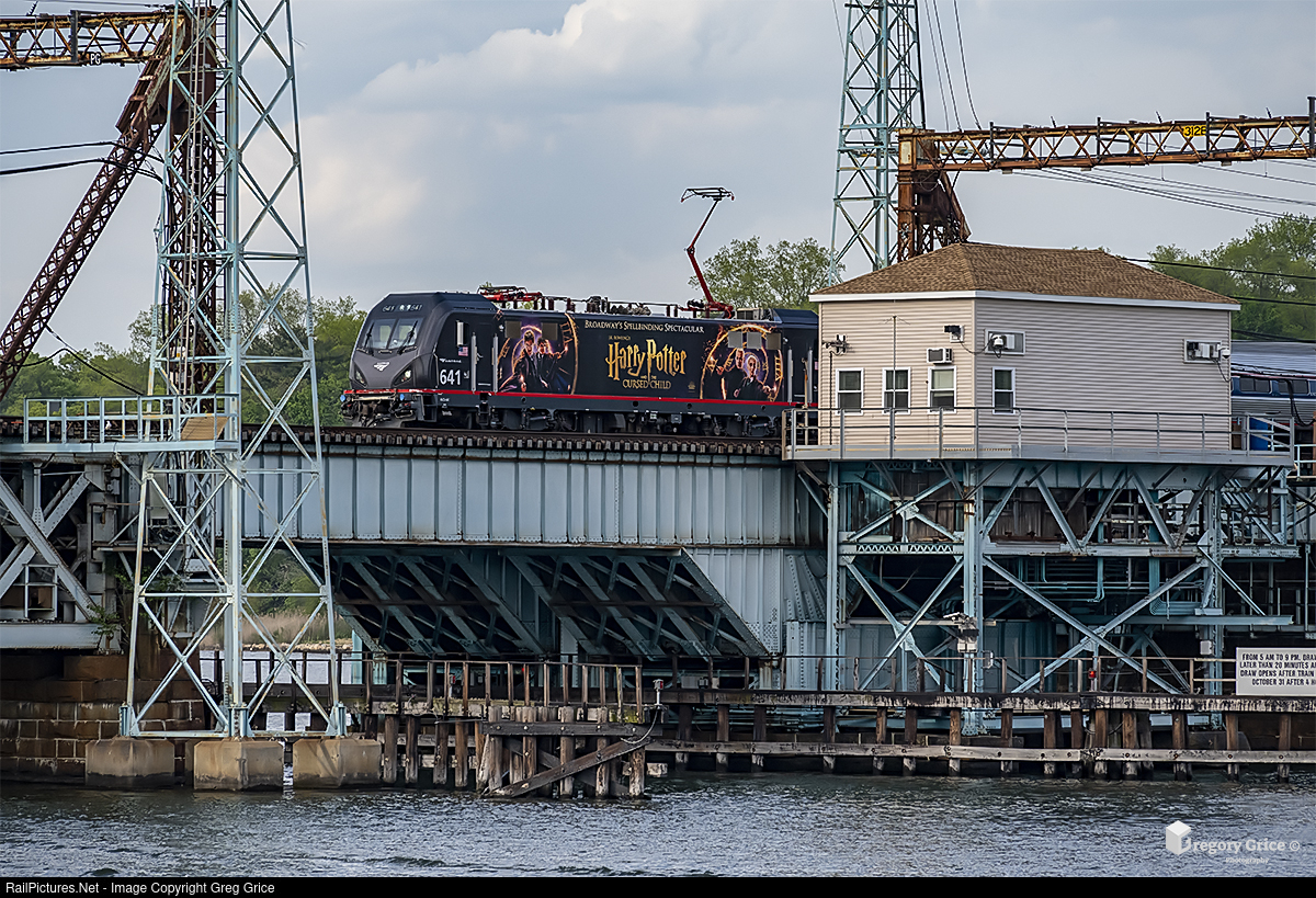 On the evening of May 12th, 2023, Amtrak's Harry Potter wrapped ACS-64 #641 leads Regional train 55 across the uniquely-wireless Mianus River Railroad Bridge (CP230) on Metro-North Railroad's New Haven Line in Cos Cob, Connecticut. 641 is one of four locomotives wrapped to advertise the Broadway show “Harry Potter and the Cursed Child”, which is playing at the Lyric Theatre in New York City.