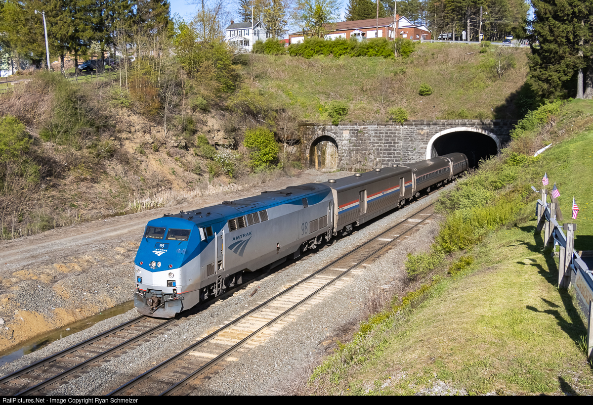 | Amtrak's westbound Pennsylvanian exits the main tunnel at Gallitzin. Originally two single track tunnels, the tunnel to the left was sealed when the right bore was enlarged to handle two tracks. Another active single track tunnel exists just to the south of this location which handles much of the eastbound traffic. |