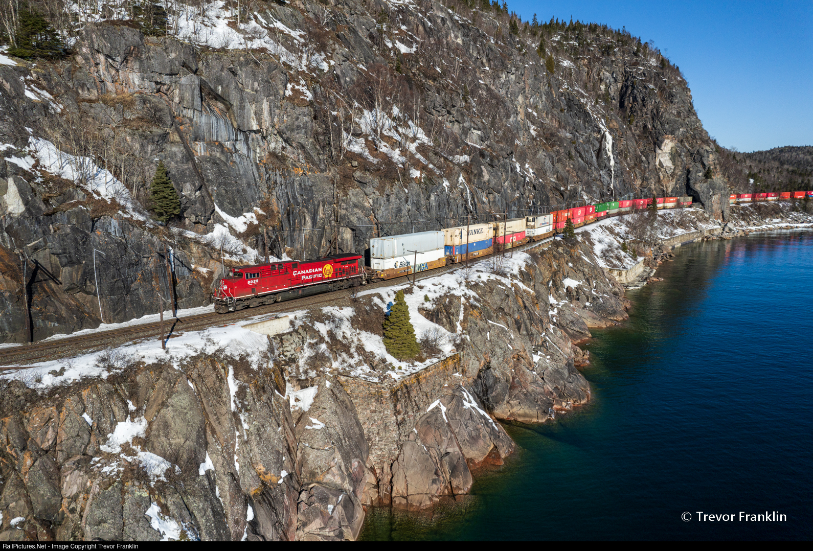| The ice has left Mink Harbour while the snow blanketing the rock cuts and crevices recedes after a couple consecutive days of sun, despite the mercury still hovering around zero while this early morning intermodal rumbles through. |