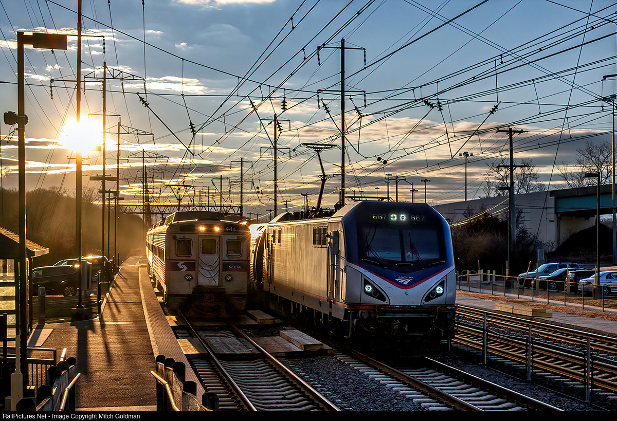 | An eastbound early evening Amtrak Regional Express roars past a SEPTA commuter train the Cornwells Heights station just north of Philadelphia, in Bensalem, PA. A soon to set Sun makes its way across the Northeast Corridor providing for some rather spectacular photo opportunities. |