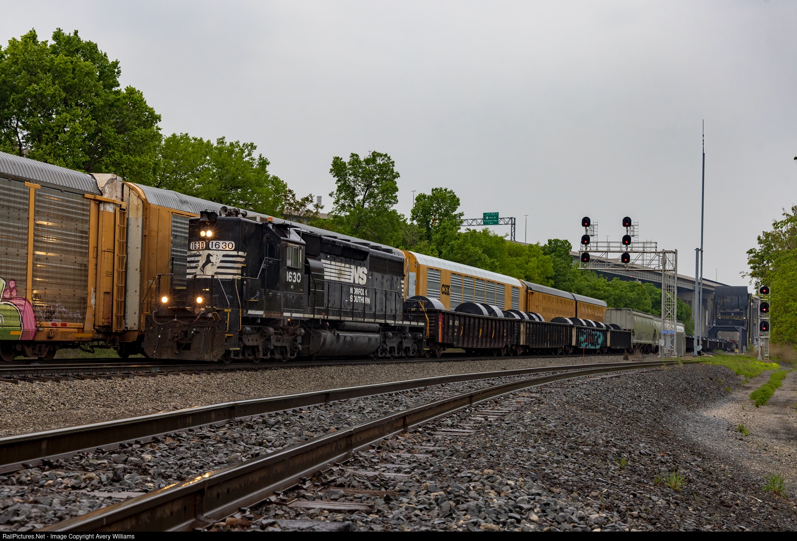| NS 1630 leads NS BD27 though Detroits Delray Neighborhood on a rainy evening. NS 1630 a non PTC unit can be seen here going though a PTC Controlled Control Point, a rare sight to see with a Highhood in 2023.