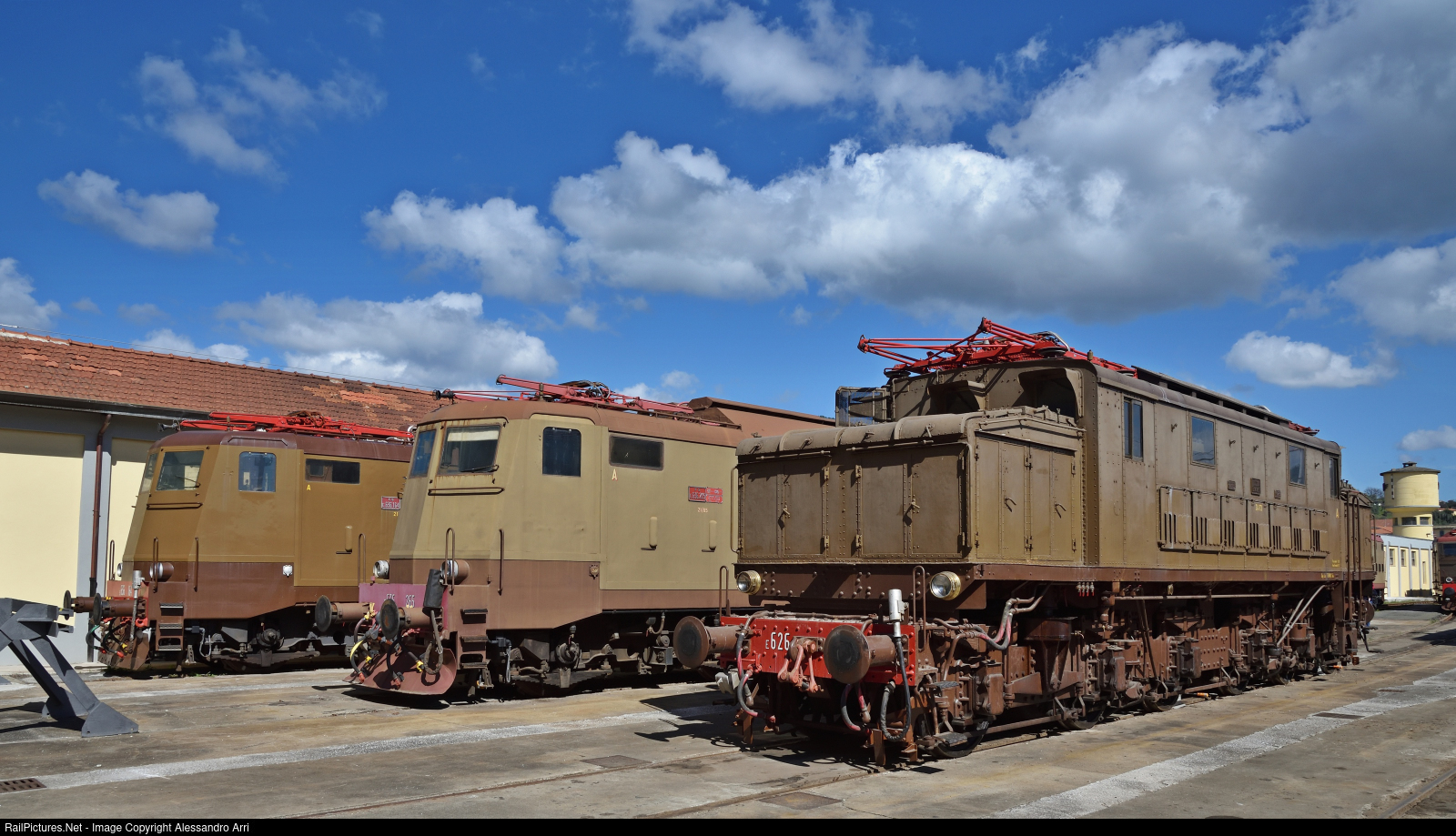 Historic locomotives e626 266, e636 265 and e636 164 (equipped with SCMT safety system) preserved by FS Foundation for special trains, displayed at DORS depot in La Spezia Migliarina.