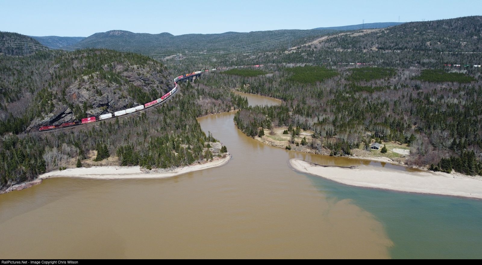 CPKC train 101-19 the hotshot from Toronto to Vancouver heads thru some of the most rugged country in Ontario. The silt of the Little Pic River mixed into Lake Superior.