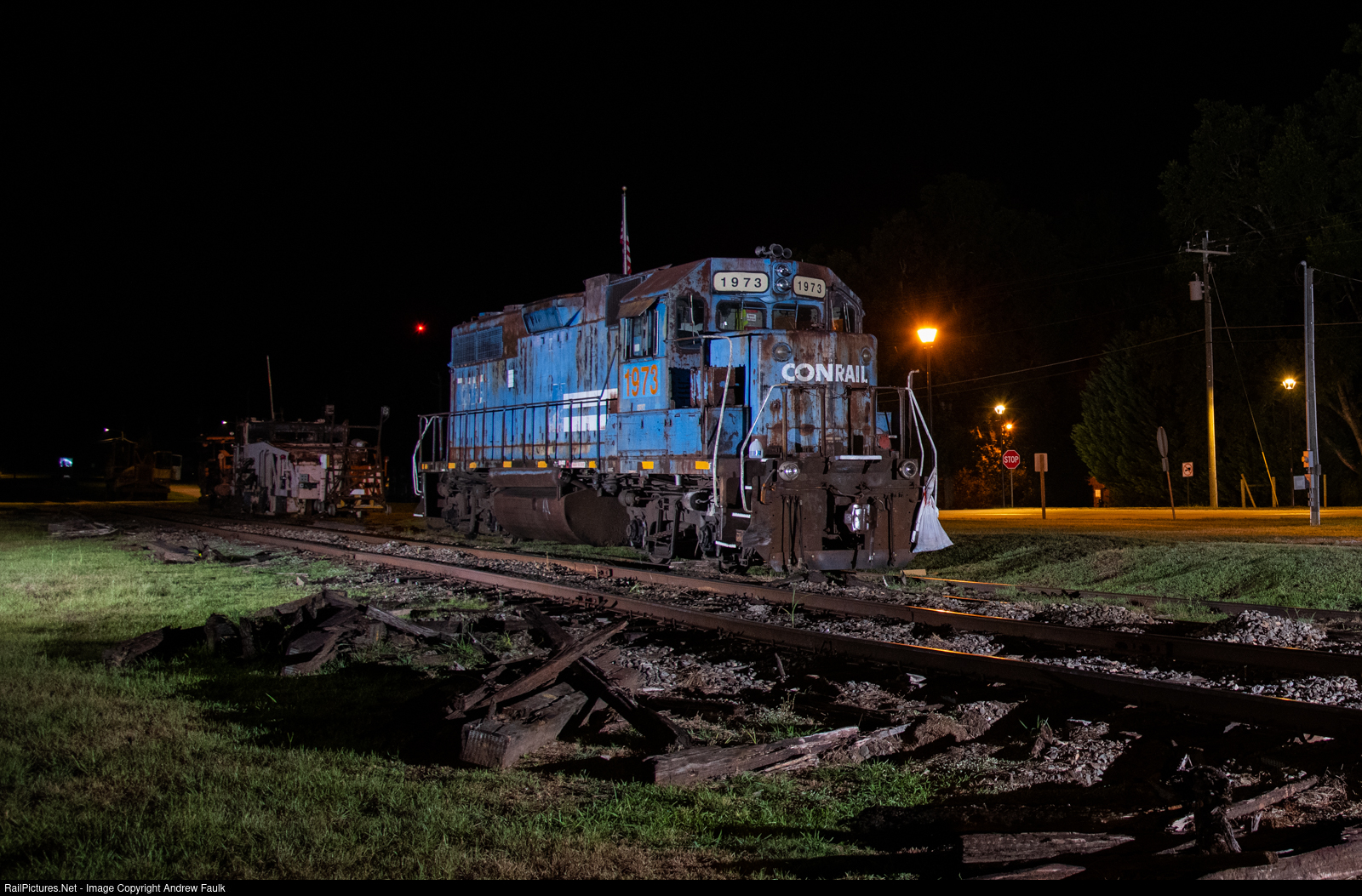 Ex-Conrail now Hartwell GP38 No. 1973 sits tied down in Bowersville.