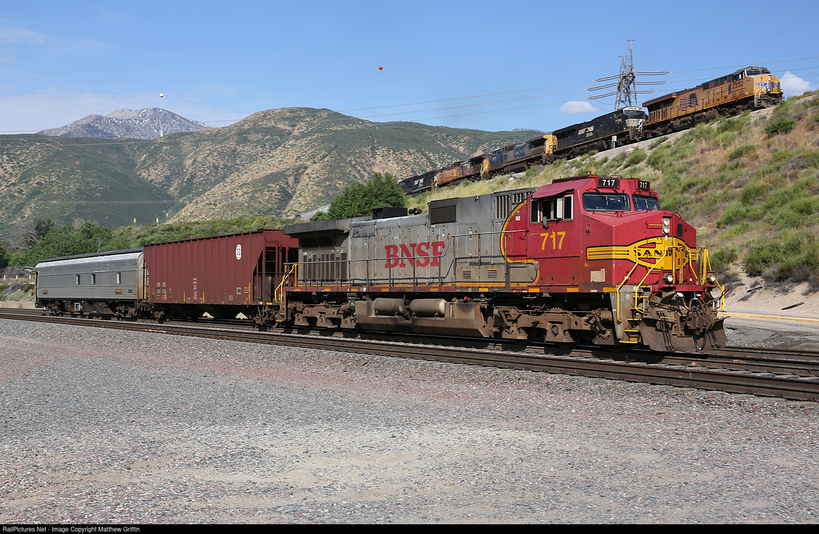 | Perfect timing took place at Blue Cut between BNSF 717 leading eastbound geo train ULACCHI, and UP 2552 with a colorful lashup above on the Mojave Sub with the MWCNP. |