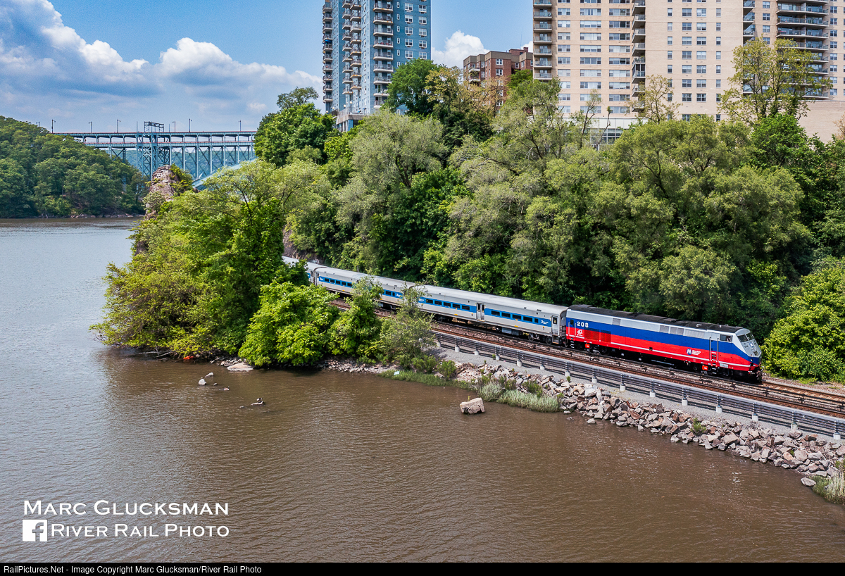Beachball On The Move! In order to set up its first revenue run the next day, on Monday, May 22, 2023, MNCW 208 (P32AC-DM) was brought out to be turned with a “maxi-bomb” (7 coach) consist to face in the southbound direction. A week prior, it was released from railroad’s North White Plains shop in a commemorative “beachball” paint scheme heritage wrap in honor of its 40th anniversary. This paint scheme was used on the FL9s as well as still being present on some west of Hudson equipment. MTA Metro-North Railroad President Catherine Rinaldi announced that there would be 5 wraps honoring predecessor railroads, to include New York Central, Penn Central, and Conrail. The train is seen in Marble Hill, New York passing through the rock cut towards Spuyten Duyvil with the Henry Hudson Bridge in the background.
