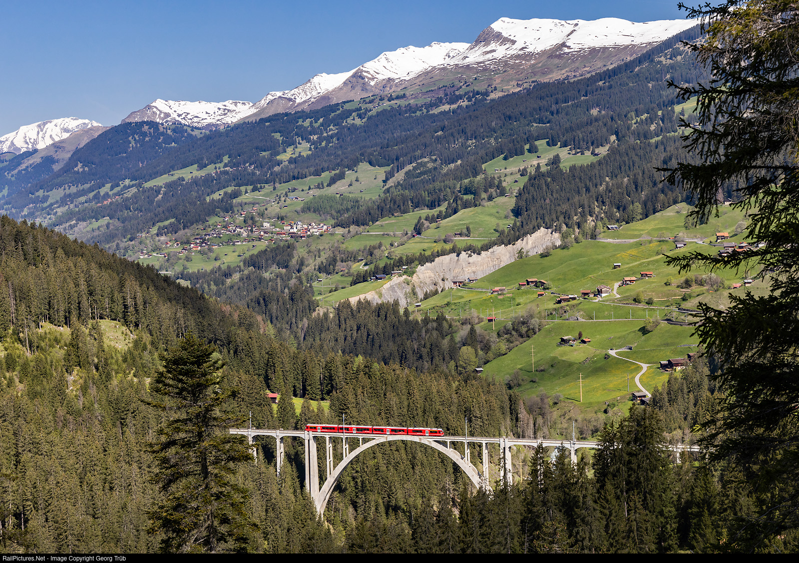 "Stammnetzallegra" or STZ (Stammnetztriebzug) ABe 4/16 # 3105 of the Rhaetian Railway is crossing the 284 meter long and 62 meter high Langwieser viaduct, on the Arosa line between Litzirüti and Langwies, with the village of Peist in the background. Operation of this train type is rather new on this line with steady grades of 6.0 %. Usually there are the "Allegra" ABe 8/12 (ZTZ Zweispannungs Triebzug) operating on this line, which have the double power and can pull up to 4 cars. On the opposite valley slope, you can see the railway line going from Langwies towards Peist and finally Chur. The Langwieser viaduct was built in 1913/1914 for the then independent Chur-Arosa Bahn (ChA), which was taken over by the Rhaetian Railway in 1942. The line was electrified since the opening in 1914 with 2400 V DC, but was changed to 11000 V 16,7 Hz AC in 1997 (now the same as the RhB main network).