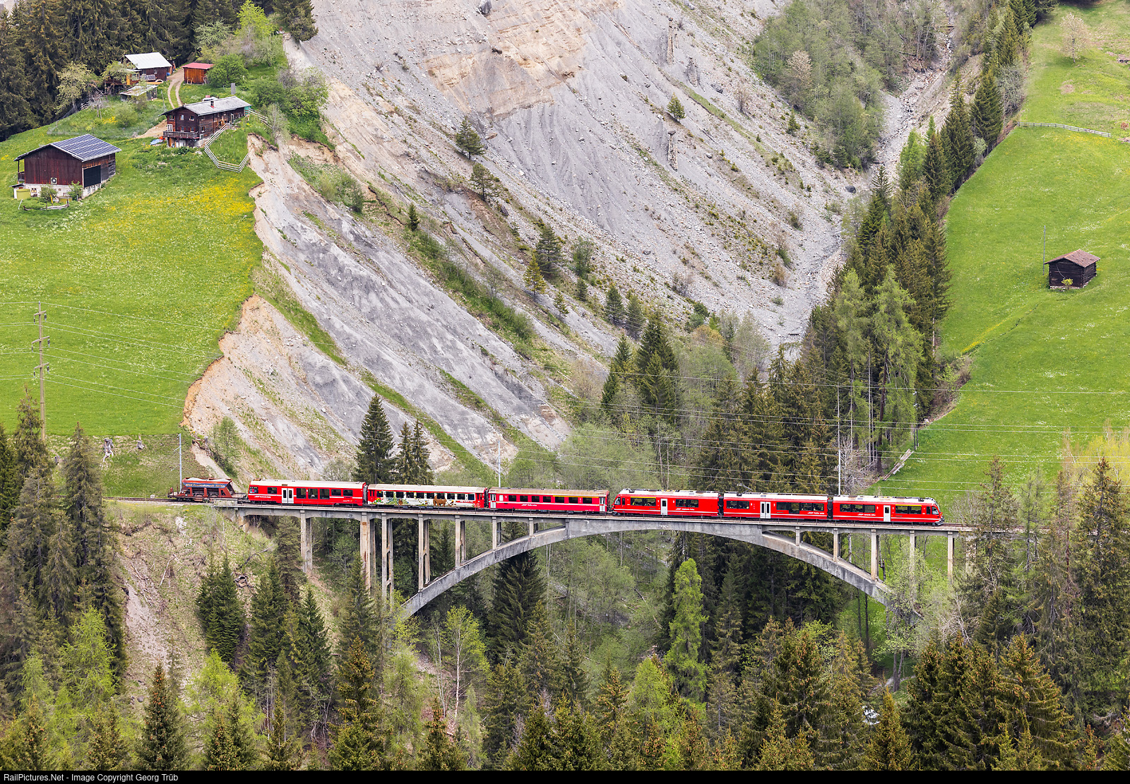 "Allegra" ABe 8/12 # 3503 of the Rhaetian Railway is crossing the 145 meter long and 46 meter high Gründjitobel viaduct between Peist and Langwies, on the line from Chur to Arosa, with train R 1437. This is a push pull train with a mixed first/second class standard car type II, a second class standard car type I in the "Bärenland" paint scheme and a cab car BDt. In the very rear is a loaded gravel car Fad of the ARGE Frischbetonwerk Arosa. The load is near the maximum for the "Allegra" on this line with steady grades of 6.0 % and narrow curves with a radius of 52 meter. The maximum velocity on this line is 35 km/h only. The impressive viaduct leads the railway line over the Gründjitobel, a steeply eroded gravel moraine gorge, with sandy formations known as "Steimannli". The main span consists of an arch with an 85 metres (279 ft) long span, and a rise of 46 metres (148 ft) above the valley floor.