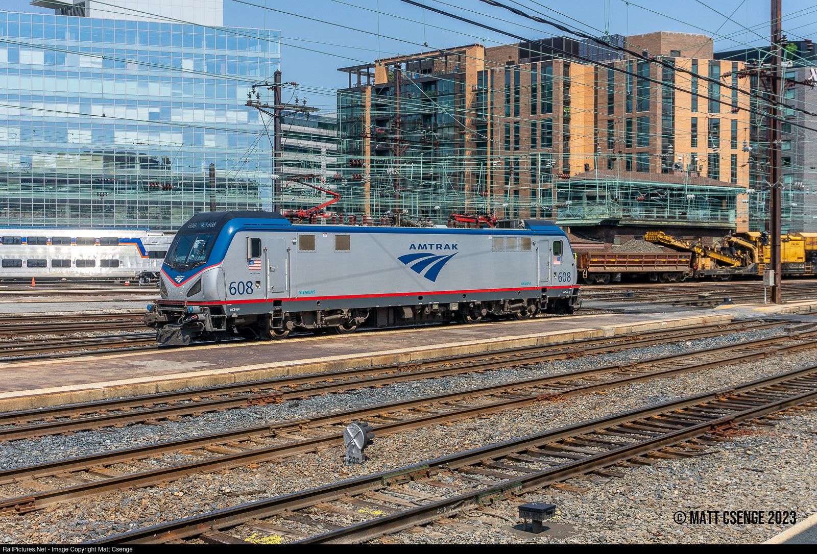 Amtrak ACS-64 no. 608 (Siemens Amtrak Cities Sprinter, 2012-2016) is seen creeping in to Washington Union Station, where it will couple onto the consist of Northeast Regional Train 88 to take over operation from here to Boston. |