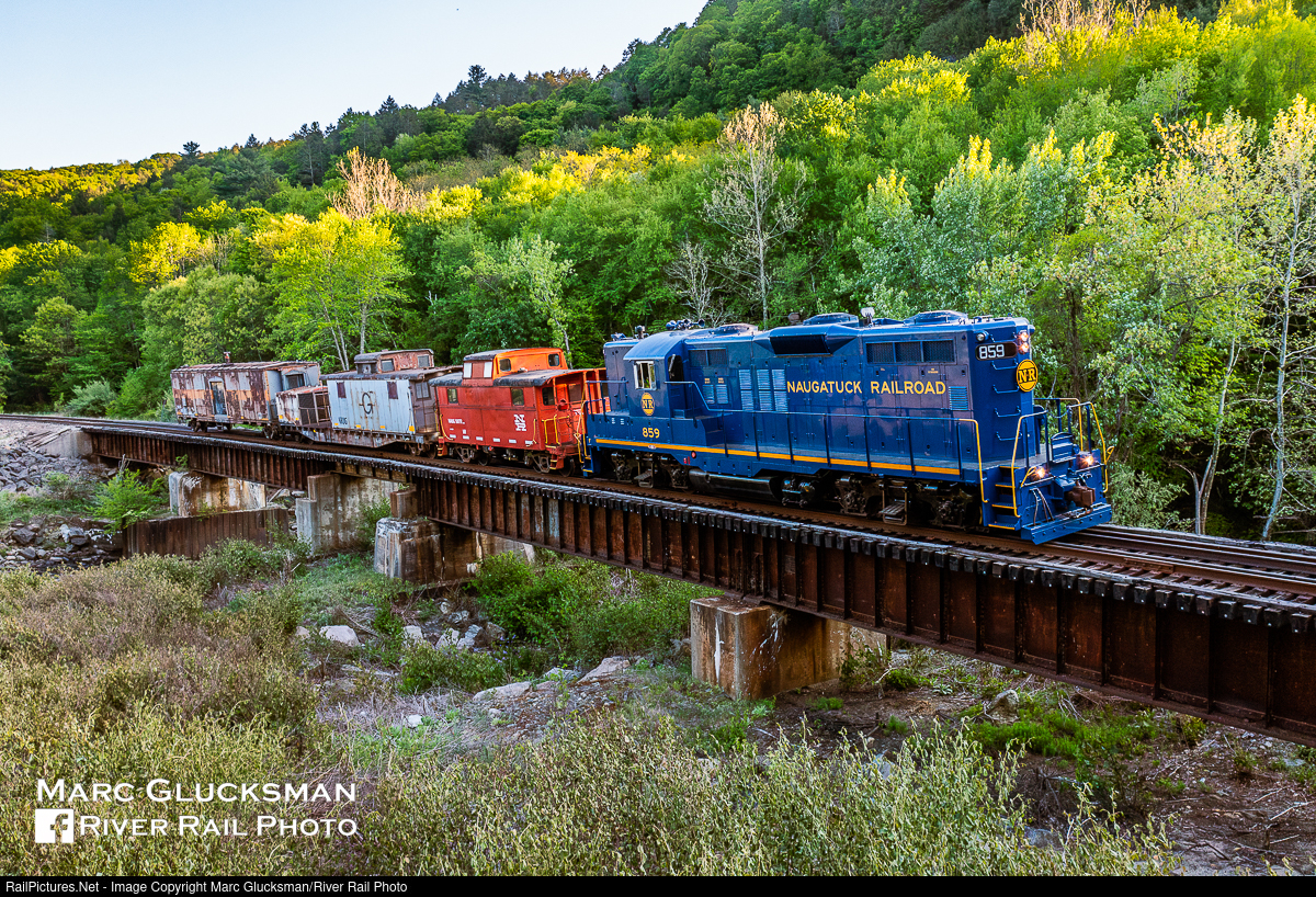 Cabooses. On Thursday, May 18, 2023 CSX/Pan Am Train PL-1 three gifts for the Railroad Museum of New England. MEC/BM 77 caboose flat and MEC/BM 249 a converted troop slpr, both assigned to the “wreck train” as well as MEC 20141 (Maine Central XP box car) were donated by CSX as that railroad consolidates its properties and deaccessions excess equipment. Recently rebuilt NAUG 859 (née-NW 859, GP9, 6/1959) in its Pevler Blue and N-5 Caboose 507 were assigned to the the Naugatuck’s freight that day and took the handoff. After dropping off the box car, the train is seen crossing Jericho Bridge in Thomaston, Connecticut. Congratulations to everyone involved in making this process work for all parties involved.